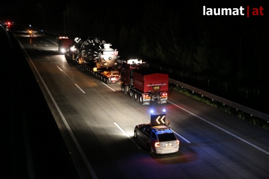 Von Sattledt, wo der Schwertransport nach dem Brand einer Zugmaschine zwischengeparkt worden war, ging es auf die Westautobahn, bis Asten-St. Florian, dann zurück auf die Mühlkreisautobahn und weiter durch das Linzer Stadtgebiet, nochmals auf die Autobahn und dann in den Schwerlasthafen. Auch die knappste Stelle, am Beginn der Mühlkreisautobahn, wo nur noch wenige Millimeter zwischen Transport und Überführung über die Autobahn Platz waren, wurden perfekt gemeistert. Nach rund sieben Stunden war das Ziel erreicht und die Verantwortlichen zeigten sich sichtlich erleichtert.