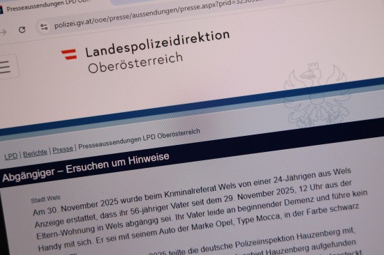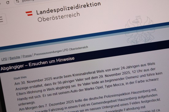 "Am 30. November 2025 wurde beim Kriminalreferat Wels von einer 24-Jährigen aus Wels Anzeige erstattet, dass ihr 56-jähriger Vater seit dem 29. November 2025 um 12:00 Uhr aus der Eltern-Wohnung in Wels abgängig sei. Ihr Vater leide an beginnender Demenz und führe kein Handy mit sich. Er sei mit seinem Auto der Marke Opel, Type Mocca, in der Farbe schwarz unterwegs. Am Morgen des 07. Dezember 2025 teilte die deutsche Polizeiinspektion Hauzenberg mit, dass das besagte Fahrzeug in einem Feld im Gemeindegebiet Hauzenberg aufgefunden worden sei. Das versperrte Fahrzeug sei im nassen Untergrund eines Feldes festgesteckt. Vom Fahrzeuglenker fehlte jedoch jede Spur. Eine großangelegte Fahndung mit Hubschrauber im Umkreis des Auffindungsortes verlief ergebnislos. Der Abgängige ist ca. 180 Zentimeter groß, wiegt ca. 90 Kilogramm, hat eine korpulente Statur und graues, kurzes Haar. Zuletzt war er mit einer dunkelblauen Winterjacke, einer dunkelblauen Jeanshose, hellblauen Schuhen (der Marke New Balance) und grauer Haube bekleidet. Nach Auffindung seines Fahrzeuges wird ein Unfall befürchtet. Das Kriminalreferat ersucht um Hinweise unter +43 59133 47 3333."