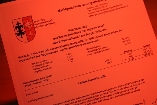 Baumgartenberg. Im Baumgartenberg (Bezirk Perg) waren am Sonntag nochmals 1.461 Stimmberechtigte zur Wahl einer neuen Bürgermeisterin beziehungsweise eines neuen Bürgermeisters aufgerufen.