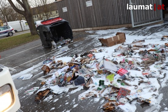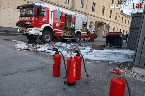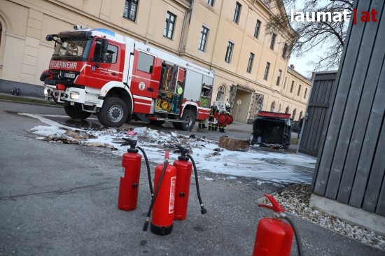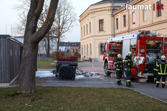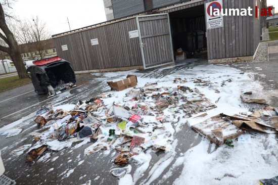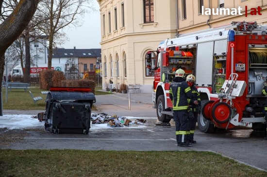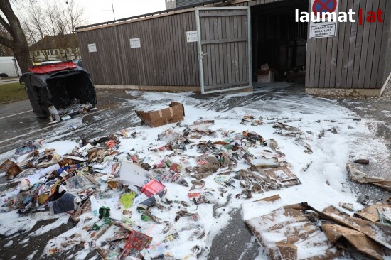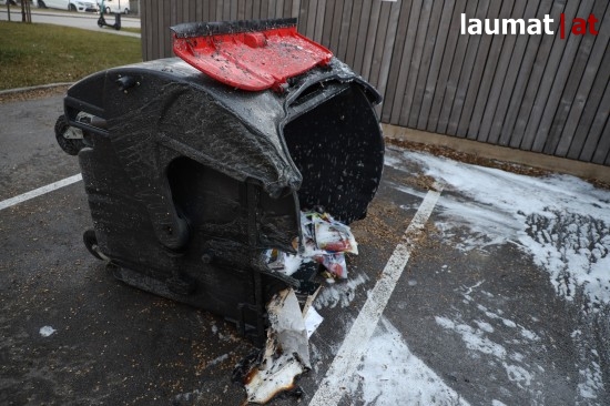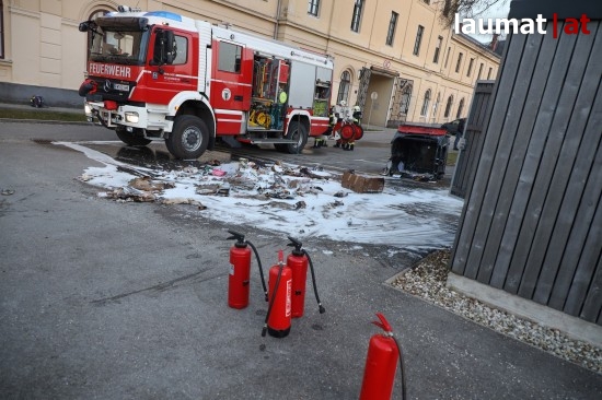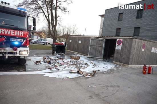 Altpapiercontainer in Müllsammelinsel einer Wohnhausanlage in Wels-Lichtenegg in Brand