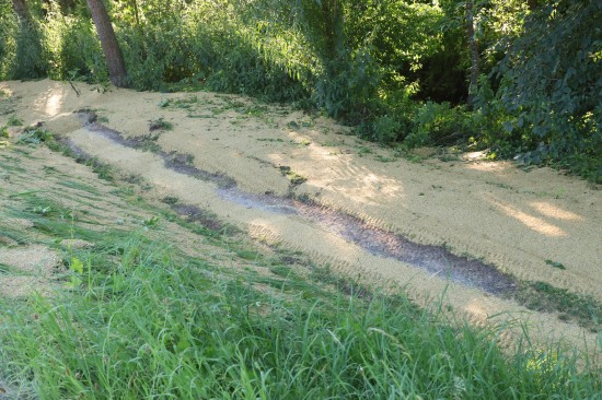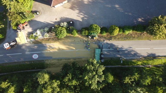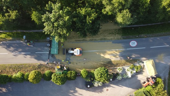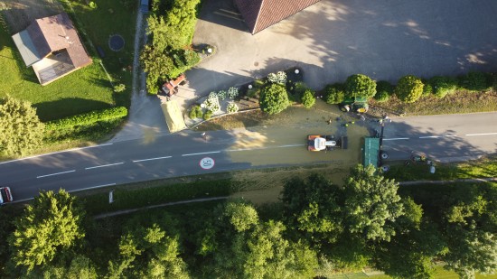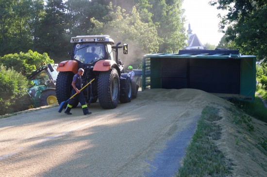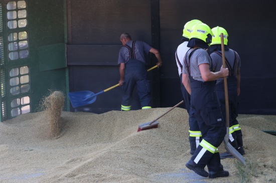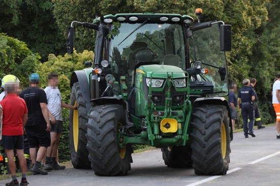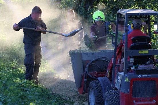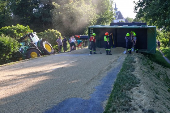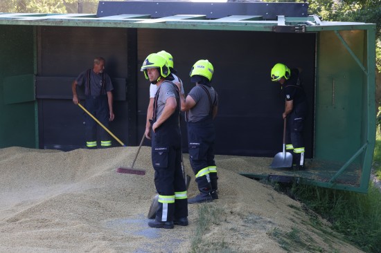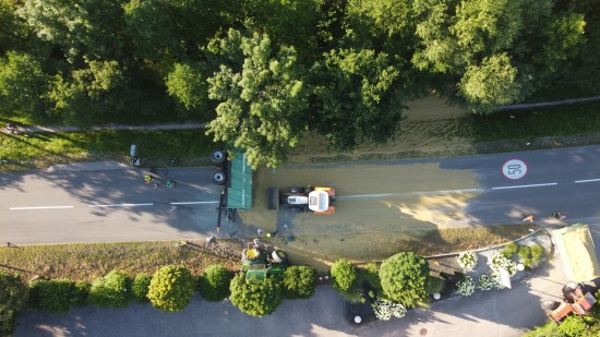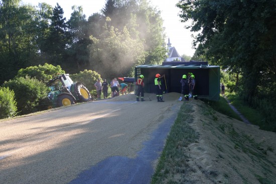 Der Unfall passierte Dienstagabend auf der L1249 Grünbachtalstraße, Bräuhausstraße, im Gemeindegebiet von Offenhausen. Aus noch unbekannten Gründen geriet ein Traktorgespann ins Schlingern und verunfallte. Der Traktor kam von der Fahrbahn ab und in Schräglage in der Böschung an einem Baum zum Stillstand. Der Anhänger stürzte um. Die Ladung verteilte sich auf der Fahrbahn der L1249 Grünbachtalstraße sowie der angrenzenden Böschung. Die Einsatzkräfte der Feuerwehr wurden zu den Aufräumarbeiten alarmiert. Weil nebenan im Bereich des Freibades der Notarzthubschrauber landete, wurde kurzzeitig Schlimmeres befürchtet, der Unfall mit dem Traktorgespann verlief jedoch zum Glück glimpflich. Die Einsatzkräfte der Feuerwehr beseitigten die verlorene Ladung, unter anderem mit Hilfe des Gemeindetraktors. In weiterer Folge wurden der umgestürzte Anhänger sowie der Traktor in Eigenregie durch die Unfallbeteiligten - mit Unterstützung der Feuerwehr - geborgen. Eine Mitarbeiterin beziehungsweise Mitarbeiter der Straßenmeisterei raparierten die beschädigte Fahrbahn der L1249 Grünbachtalstraße im Bereich der Unfallstelle.