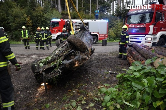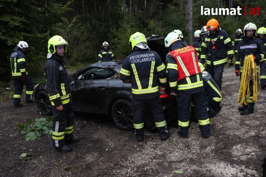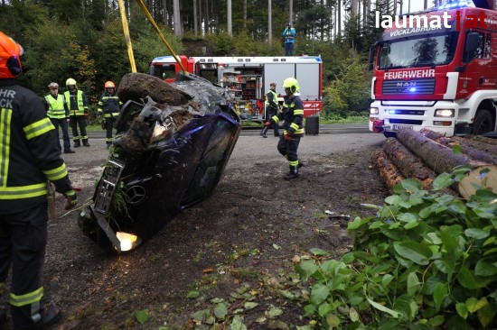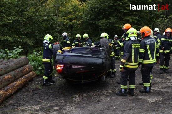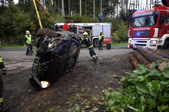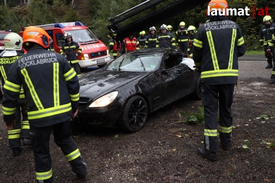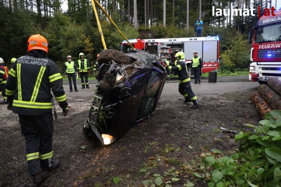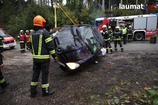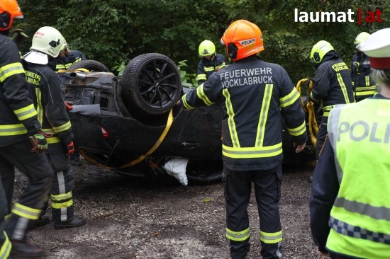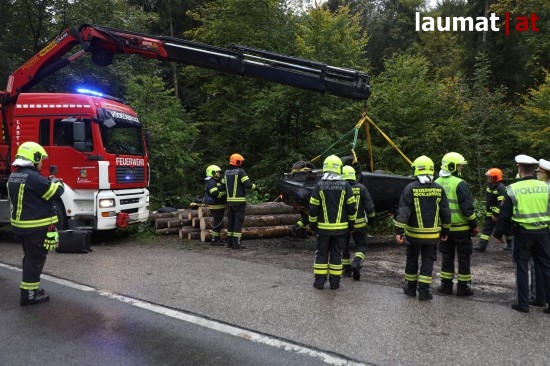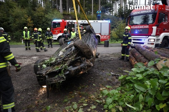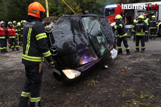 Auto bei Verkehrsunfall auf Hausruckstraße in Vöcklabruck in Bachbett überschlagen
