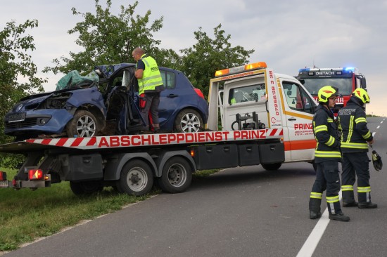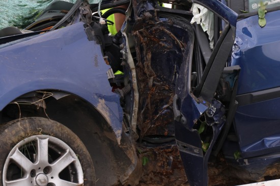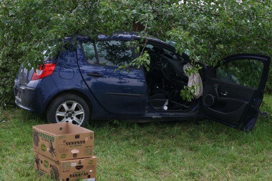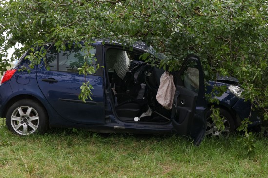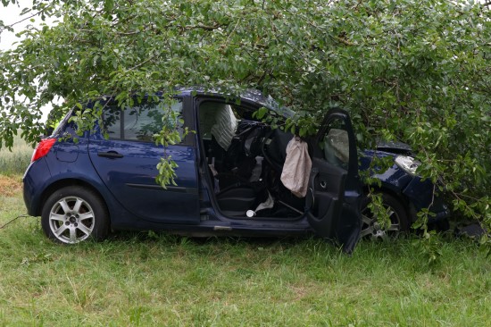 Auto bei Verkehrsunfall in Dietach mit Fahrerseite gegen Obstbaum geprallt