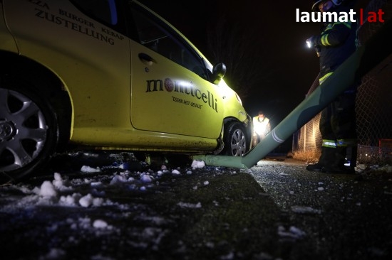 Wels. Ein Essenszustellfahrzeug ist Sonntagabend in Wels-Neustadt von der Straße abgekommen und gegen eine Straßenlaterne gekracht.