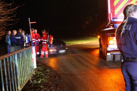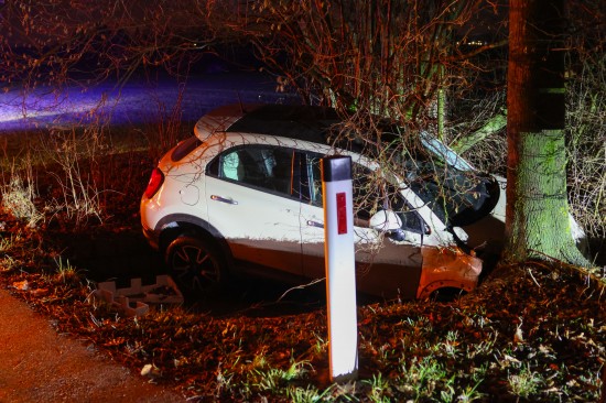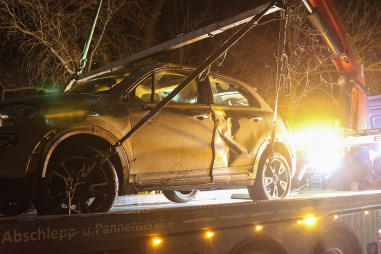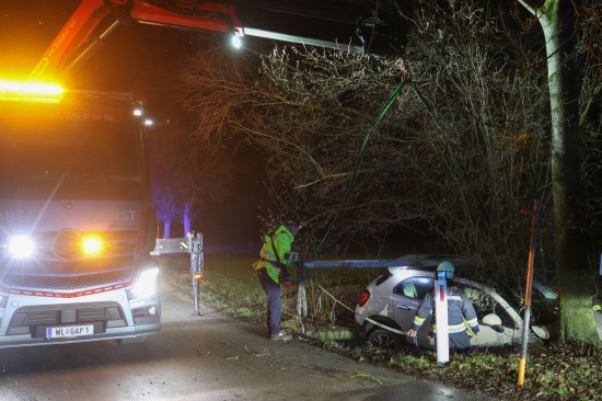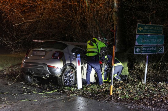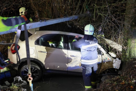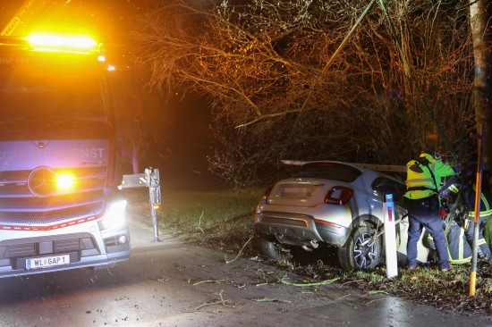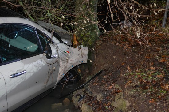 Auto bei Verkehrsunfall in Wels-Oberthan im Bachbett gegen Baum geprallt