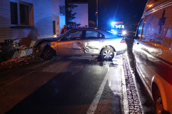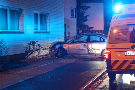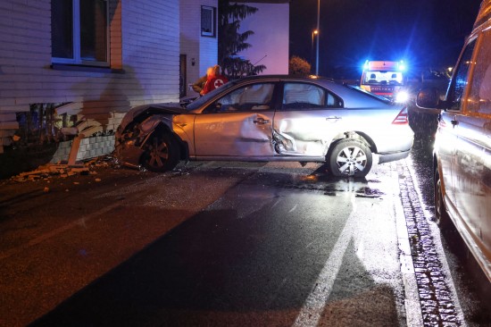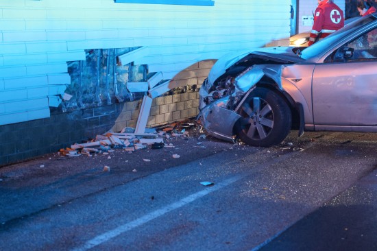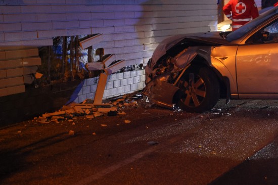 Auto bei Verkehrsunfall in Wels-Vogelweide gegen Hausfassade gekracht