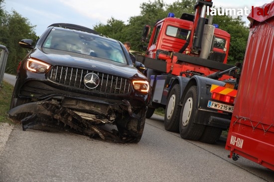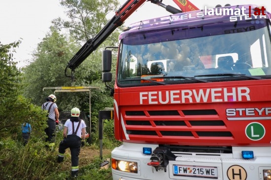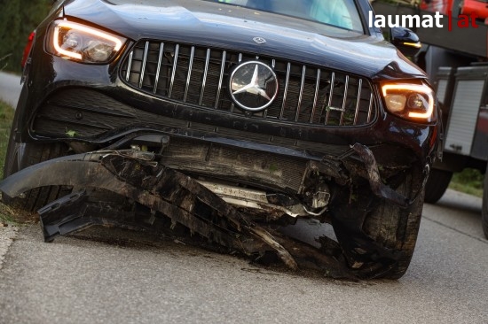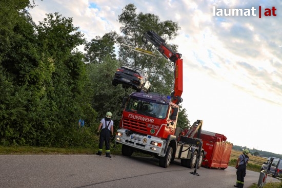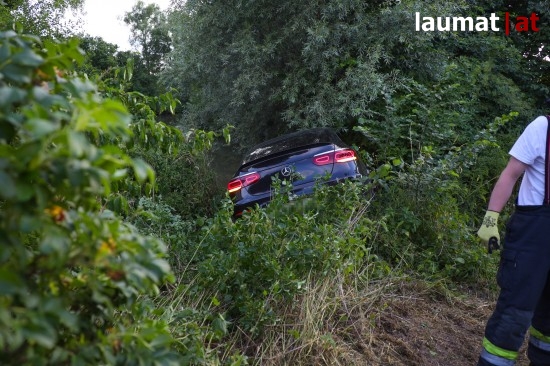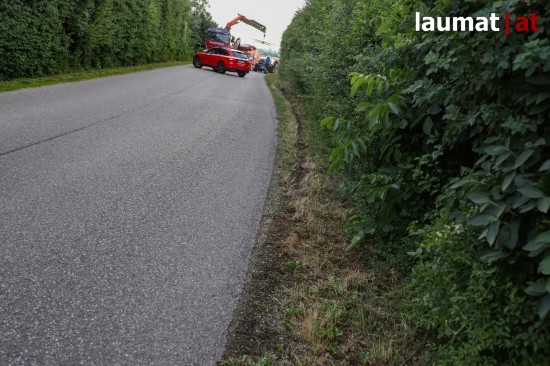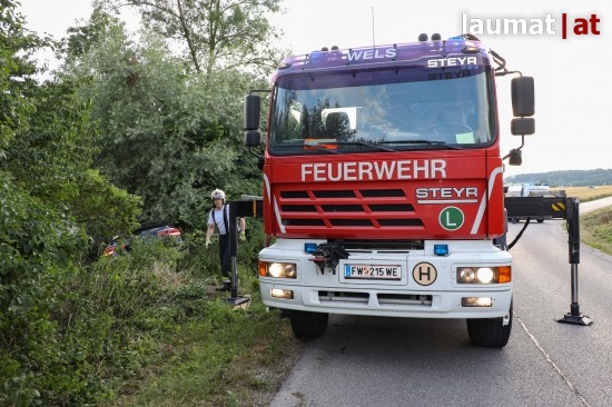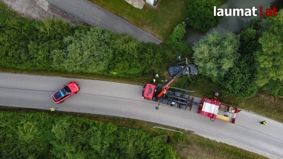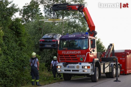 Auto bei Verkehrsunfall in Wels-Waidhausen beinahe in Teich und kleinem Bach gelandet