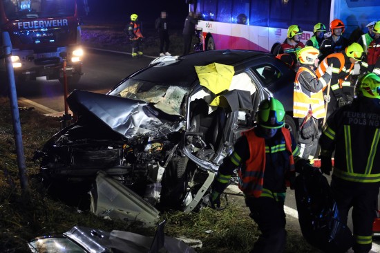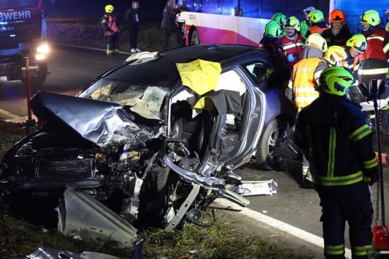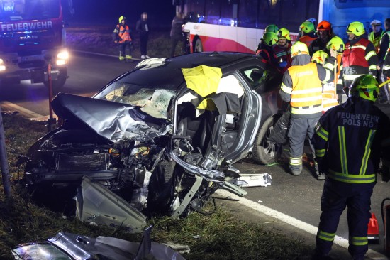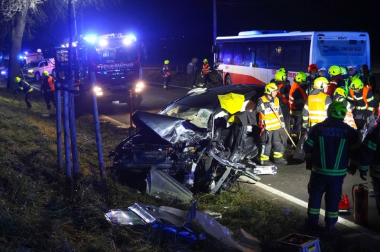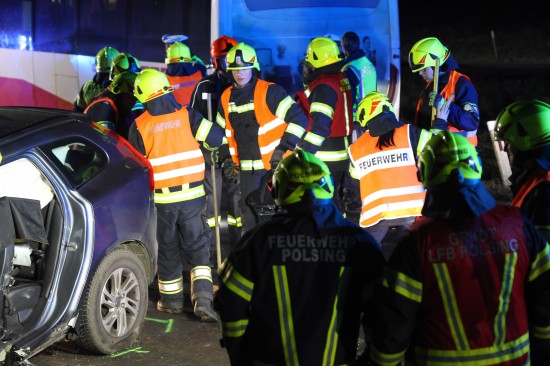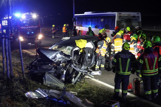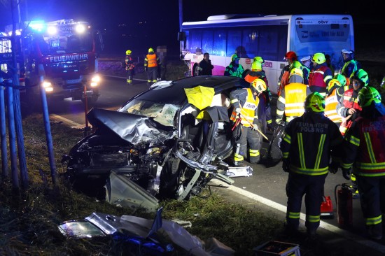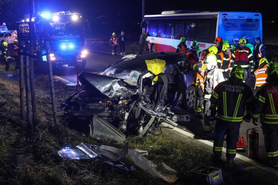 Der Unfall ereignete sich Donnerstagnachmittag auf der B129 Eferdinger Straße, auf Höhe der Ortschaft Straß, im Gemeindegebiet von Alkoven. Aus noch unbekannten Gründen kollidierten dort ein Linienbus und ein PKW. Der PKW wurde dabei schwer beschädigt. Die Einsatzkräfte der Feuerwehr mussten den schwerer eingeklemmten Lenker aus dem PKW befreien, die Beifahrerin wurde bei dem Unfall ebenfalls schwer verletzt. Der Buslenker und neun Fahrgäste des Linienbusses wurden ebenso vom Rettungsdienst betreut, mehrere Personen wurden zur Kontrolle ins Krankenhaus gebracht. Die Feuerwehr führte in weiterer Folge die Aufräumarbeiten an der Unfallstelle durch. Für den ebenfalls erheblich beschädigten Linienbus wurde ein Bergedienst angefordert, da erste Abschleppversuche nicht zum gewünschten Ziel führten.