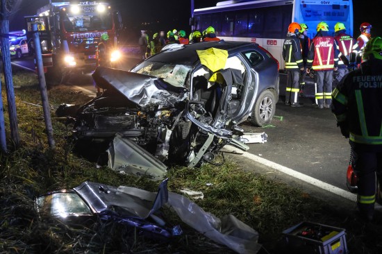 Auto gegen Linienbus: Zwei Schwerverletzte bei Frontalkollision auf Eferdinger Straße in Alkoven