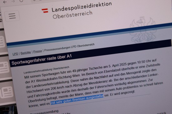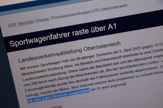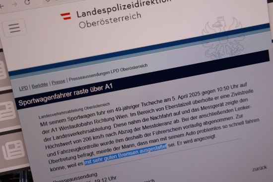 "Mit seinem Sportwagen fuhr ein 49-jähriger Tscheche am 05. April 2025 gegen 10:50 Uhr auf der A1 Westautobahn Richtung Wien. Im Bereich von Eberstalzell überholte er eine Zivilstreife der Polizei. Diese nahm die Nachfahrt auf und das Messgerät zeigte den Höchstwert von 206 km/h nach Abzug der Messtoleranz an. Bei der anschließenden Lenker- und Fahrzeugkontrolle wurde ihm deshalb der Führerschein vorläufig abgenommen. Zur Übertretung befragt, meinte der Mann, dass man mit seinem Auto problemlos so schnell fahren könne, weil es mit sehr guten Bremsen ausgestattet sei. Er wird angezeigt."