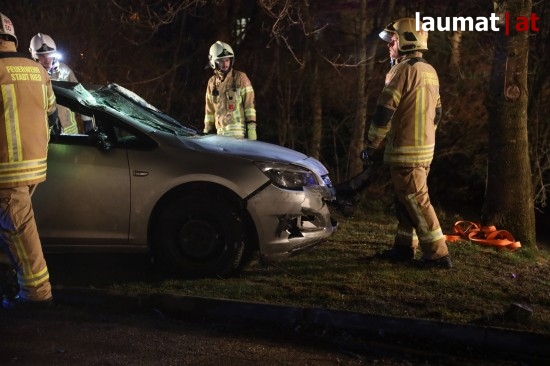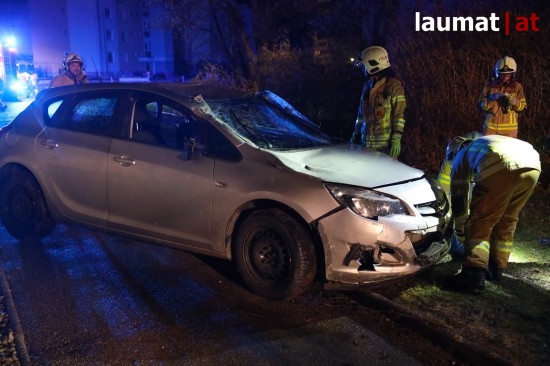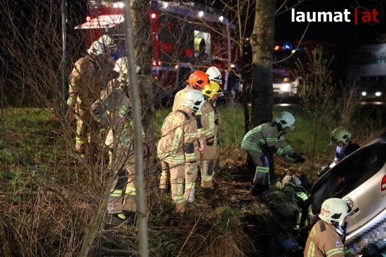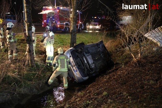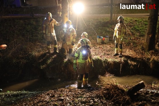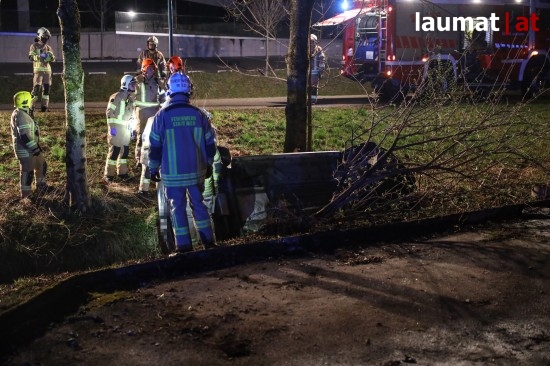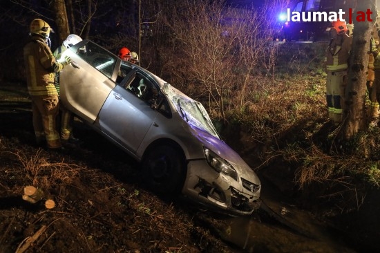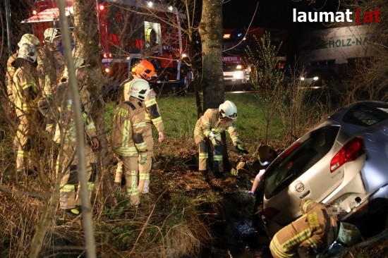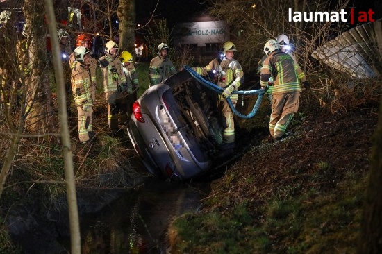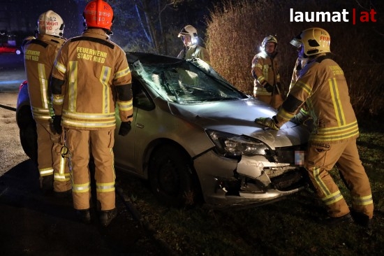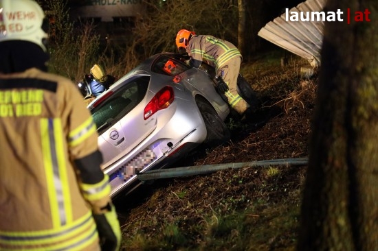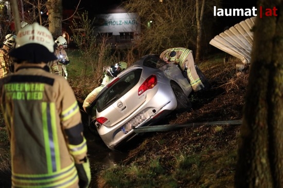 Die Feuerwehr wurde am späten Freitagabend zu einem Verkehrsunfall mit eingeklemmter Person nach Ried im Innkreis alarmiert. Ein PKW versuchte dort offenbar von einem Firmenparkplatz zu kommen, erwischte jedoch nicht die Ausfahrt sondern einen schmalen Fußweg neben dem Gebäude. Diesen Weg fuhr das Auto entlang, rammte mehrere Sträucher und Gegenstände und stürzte am Ende des Weges in den dortigen Ottenbach. Der PKW kam in seitlicher Lage im Bach zum Stillstand. Die beiden Insassen konnten von den Einsatzkräften aus dem Auto gerettet werden, sie wurden nach der Erstversorgung am Einsatzort ins Krankenhaus Barmherzige Schwestern Ried eingeliefert. Die Feuerwehr führte anschließend die Bergung des verunfallten Wagens durch.