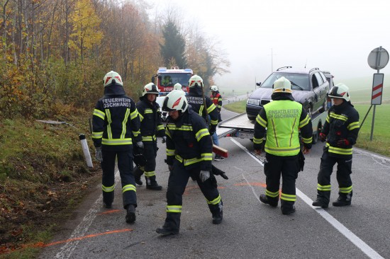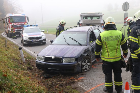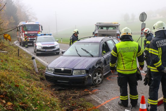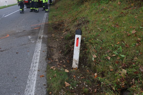 In Gschwandt (Bezirk Gmunden) ist Freitagmittag ein Autolenker mit einem PKW von der Fahrbahn abgekommen und mit Verkehrszeichen und der dahinterliegenden Böschung kollidiert.