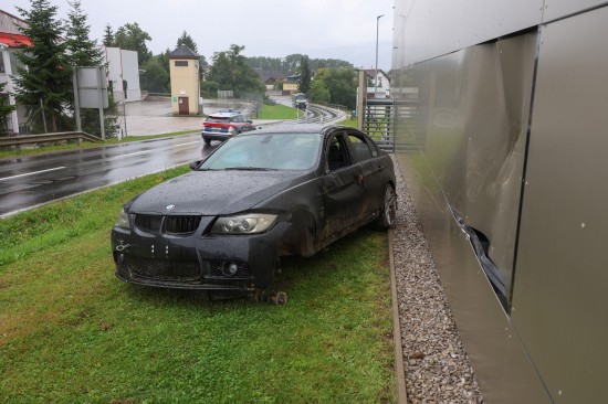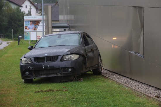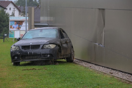 Auto in Wartberg an der Krems gegen Fassade eines Lebensmittelmarktes überschlagen