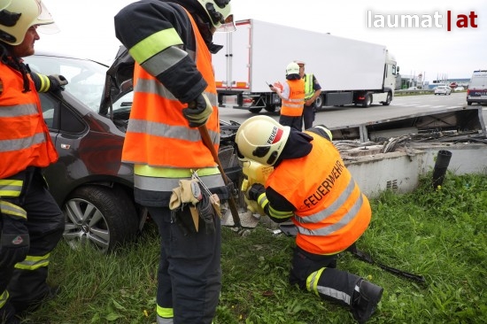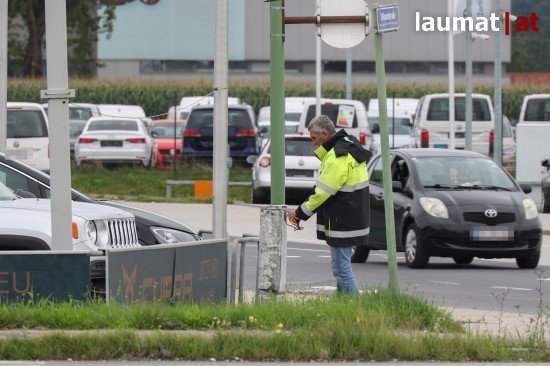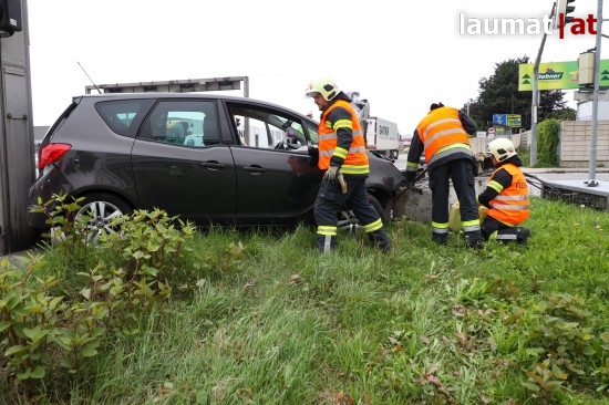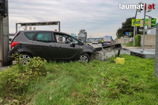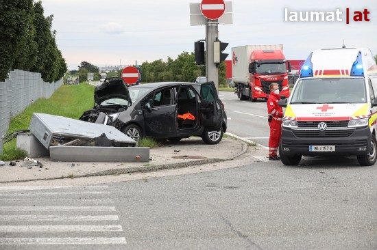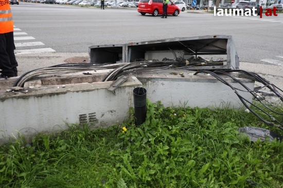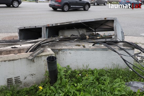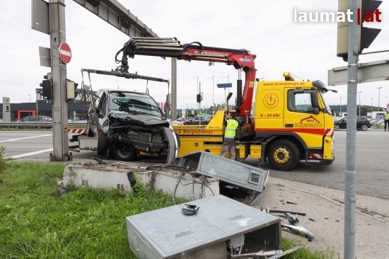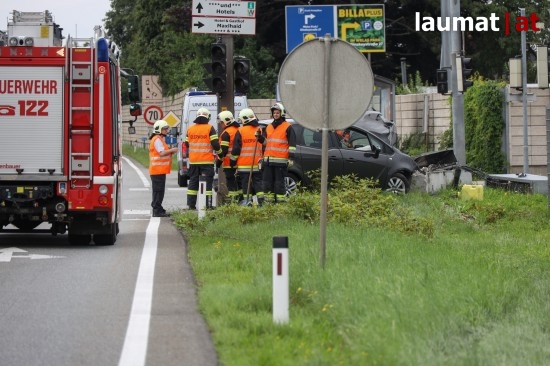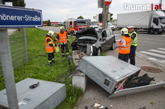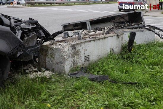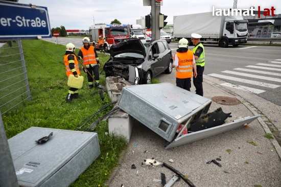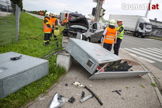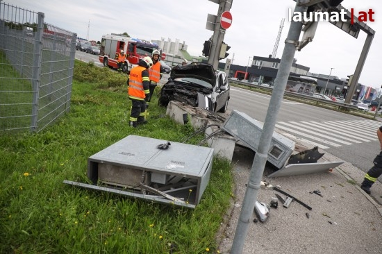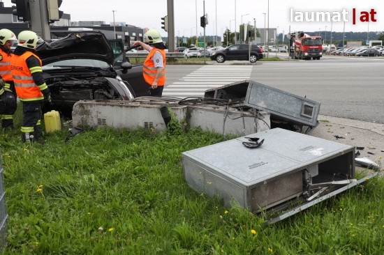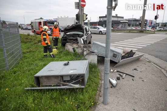 Auto kollidiert bei Verkehrsunfall in Wels-Schafwiesen mit Steuerungskasten der Ampelanlage