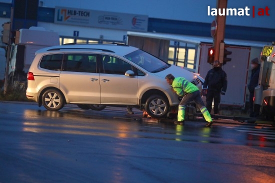 Erneut mischte der betonierte Fahrbahnteiler an der Kreuzung der Wiener-, beziehungsweise Welser Straße mit der Schafwiesen- und Sparstraße im Verkehrsgeschehen mit. Ein PKW kam auf dem Betonsockel zum Stillstand. Das Auto wehrte sich dann heftig gegen den geplanten Abtransport durch einen Abschleppdienst. Nach mehreren Anläufen konnte der PKW vom Betonsockel gehoben und abtransportiert werden.