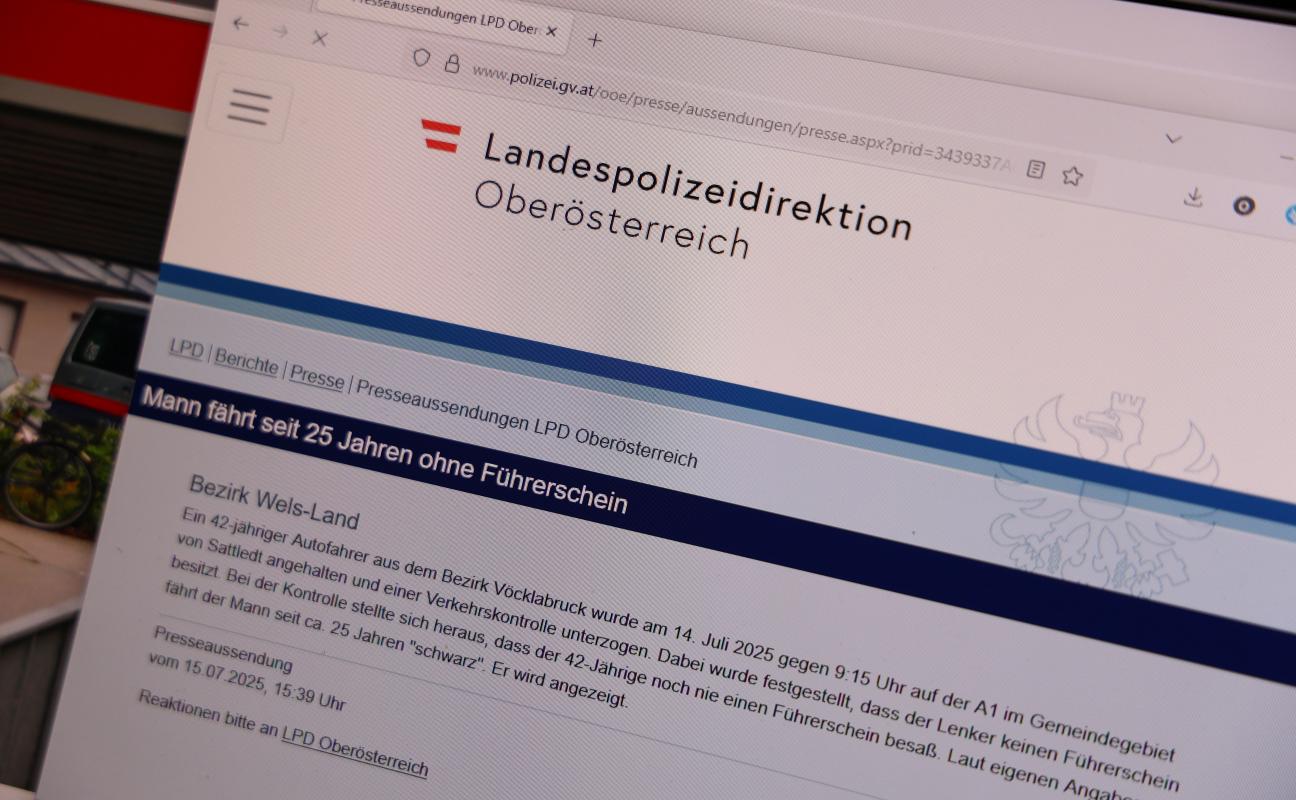 "Ein 42-jähriger Autofahrer aus dem Bezirk Vöcklabruck wurde am 14. Juli 2025 gegen 09:15 Uhr auf der A1 Westautobahn im Gemeindegebiet von Sattledt angehalten und einer Verkehrskontrolle unterzogen. Dabei wurde festgestellt, dass der Lenker keinen Führerschein besitzt. Bei der Kontrolle stellte sich heraus, dass der 42-Jährige noch nie einen Führerschein besaß. Laut eigenen Angaben fährt der Mann seit ca. 25 Jahren "schwarz". Er wird angezeigt."