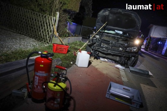 Der Unfall ereignete sich in der Nacht auf Samstag in der Raiffeisenstraße Marchtrenk. Ein Autolenker hat aus bisher noch unbekannten Gründen die Kontrolle über sein Fahrzeug verloren. Der PKW fuhr zuerst eine Straßenlaterne um, krachte dann gegen einen Gartenzaun samt Hecke und rammte noch einen weiteren Gartenzaun. Der Unfalllenker blieb unverletzt. Weil im Auto nach dem Crash Rauch wahrnehmbar war, wurde die Feuerwehr zu einem PKW-Brand alarmiert. Gebrannt hat zum Glück dann aber nichts, dennoch waren umfangreichere Aufräumarbeiten nötig. Das Auto wurde von einem Abschleppunternehmen geborgen.