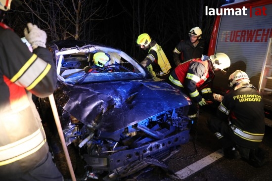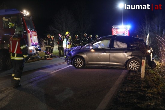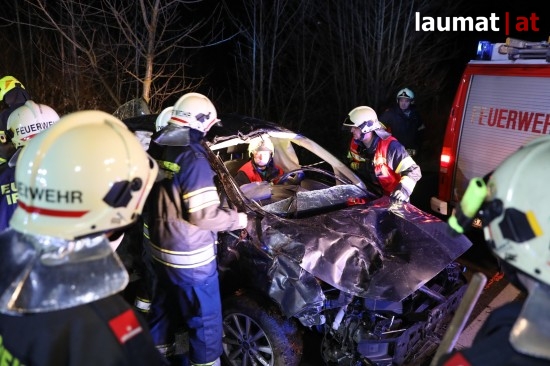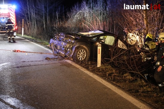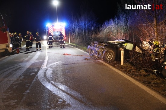 Autolenker nach Verkehrsunfall in Kremsmünster zwischen Bäumen im Unfallwrack eingeschlossen