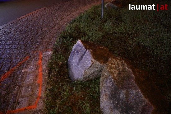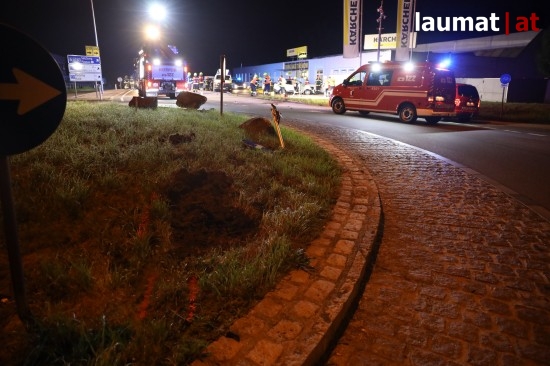 Der Unfall passierte am Mittwoch in den frühen Morgenstunden beim Kreisverkehr an der Kreuzung der B139 Kremstalstraße mit der L563 Traunuferstraße und der L563a Traunuferstraße Abzweigung Traun im Gemeindegebiet von Ansfelden. Eine Autolenkerin fuhr vor einem Kreisverkehr zuerst über eine Verkehrsinsel, dann über den Kreisverkehr, wobei der PKW gegen einen großen Stein prallte und diesen aus dem Erdreich gerissen hat. Der PKW schlitterte dann in seitlicher Lage auf einen Parkplatz neben dem Kreisverkehr, wo das Auto in Seitenlage zum Stillstand kam.