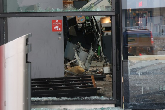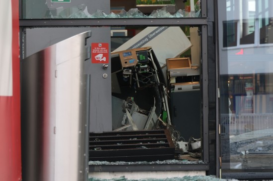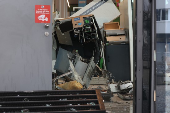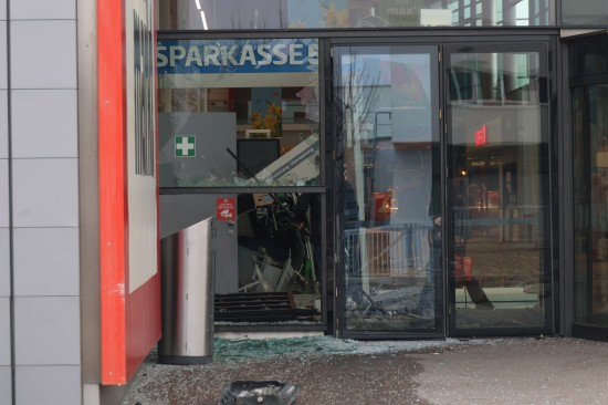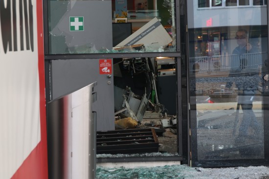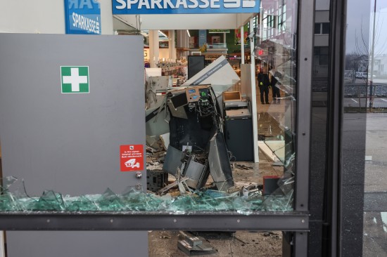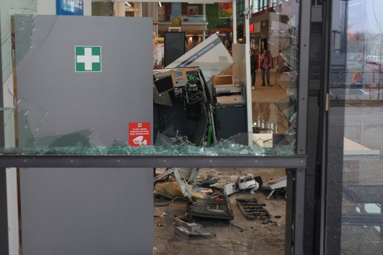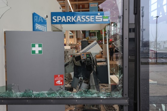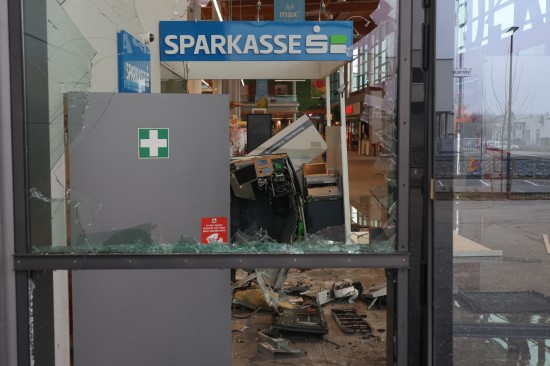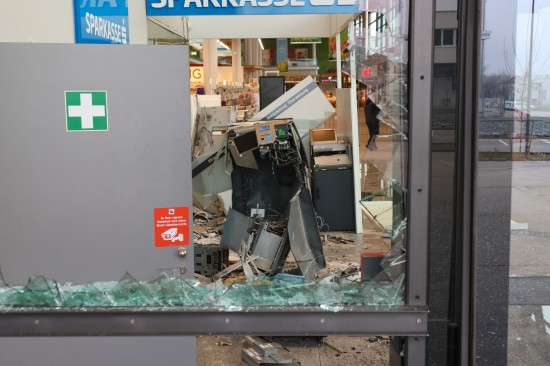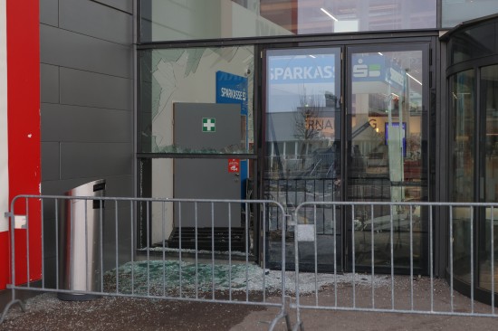 Feuerwehr und Polizei wurden in der Nacht auf Montag gegen 02:23 Uhr zu einer Alarmauslösung und einem Brandmeldealarm in ein Einkaufszentrum im Welser Stadtteil Waidhausen alarmiert. Vor Ort zeigte sich rasch, dass es sich um keinen Brand sondern um die Sprengung eines Bankomaten handelte. Der Schaden ist enorm. Im Inneren des Gebäudes blieben von der Servicestelle der Bank so gut wie nur mehr viele Trümmer übrig, Teile der gläsernen Aussenfassade, samt Fluchttüre und Drehtüre wurden beschädigt beziehungsweise gingen zu Bruch. Am frühen Montagvormittag war man dann damit beschäftigt, den Kundenverkehr über den Eingang wieder zu ermöglichen und zahlreiche Sicherungsmaßnahmen an der Fassade sowie im Inneren vorzunehmen. Die Polizei bestätigte am Montagvormittag den Vorfall. Eine Alarmfahndung sei eingeleitet worden. Mittlerweile ist in mehreren Berichten von zwei Bankomaten die Rede, bei der Polizei war am Vormittag dazu niemand erreichbar.
