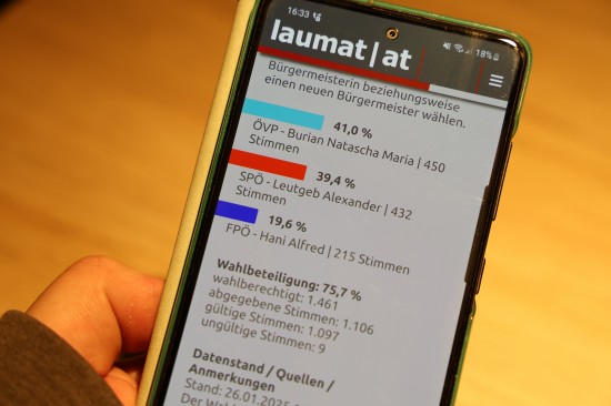 Natascha Burian (ÖVP) erreichte 41,0 % der Stimmen, gefolgt von Alexander Leutgeb (SPÖ) mit 39,4 %. 18 Stimmen lagen zwischen den beiden Erstplatzierten, zwischen denen es nun am 09. Februar 2025 zur Stichwahl kommt. Alfred Hani (FPÖ) bekam 215 Stimmen und ist mit 19,6 % damit aus dem Rennen um den Bürgermeistersessel.