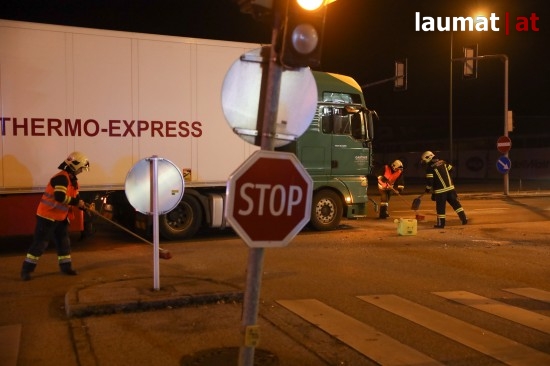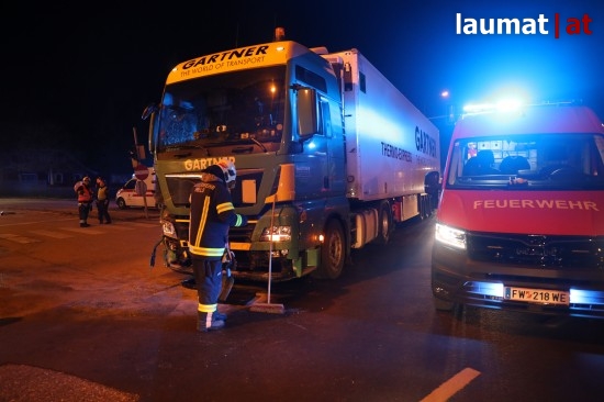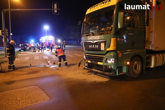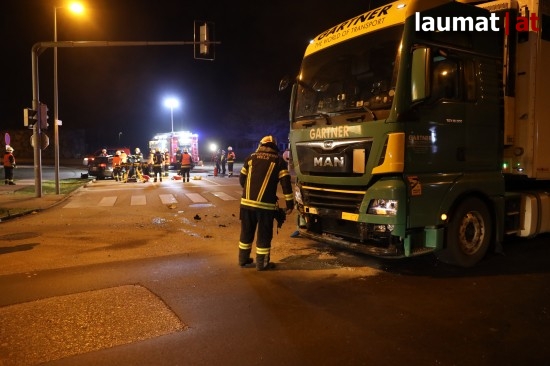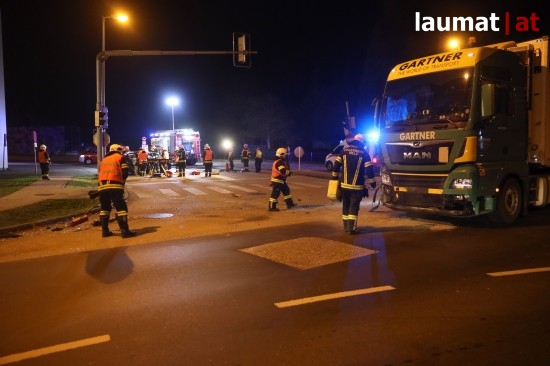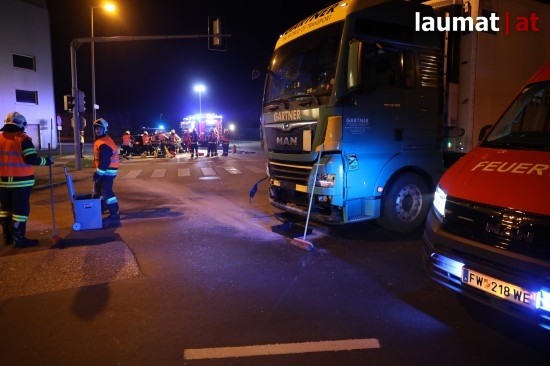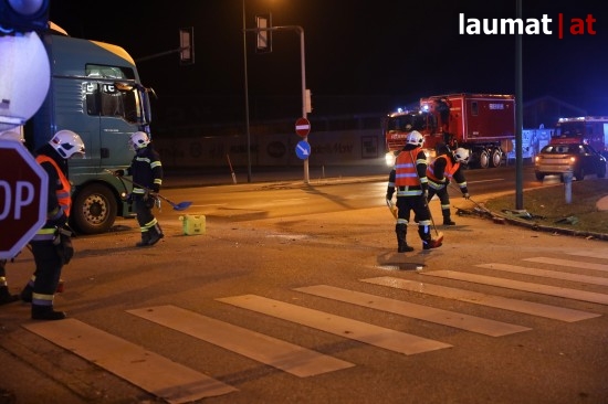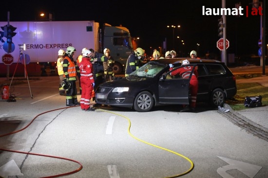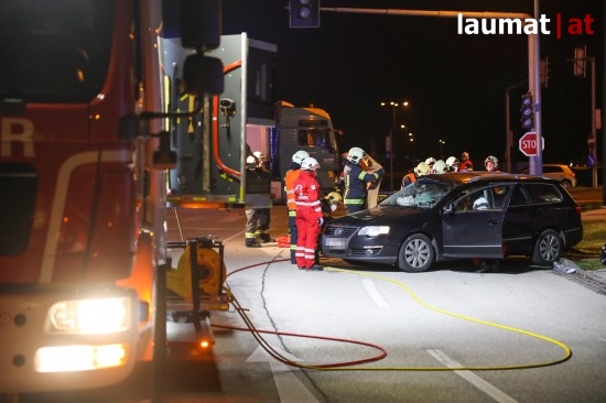 Im Kreuzungsbereich der B1 Wiener- beziehungsweise Salzburger Straße mit der Lichtenegger Straße und der Malvenstraße im Welser Stadtteil Waidhausen kam es aus bisher unbekannter Ursache zu einer Kollision zwischen einem LKW und einem PKW. Die beiden Insassen des PKW wurden bei dem Unfall verletzt, der Beifahrer musste von der Feuerwehr mittels hydraulischem Rettungsgerät aus dem PKW befreit werden. Ausgelaufene Betriebsmittel wurden gebunden. Der LKW-Lenker blieb unverletzt.