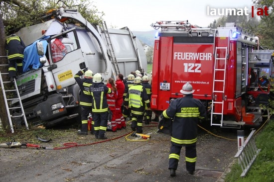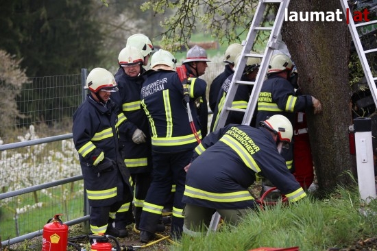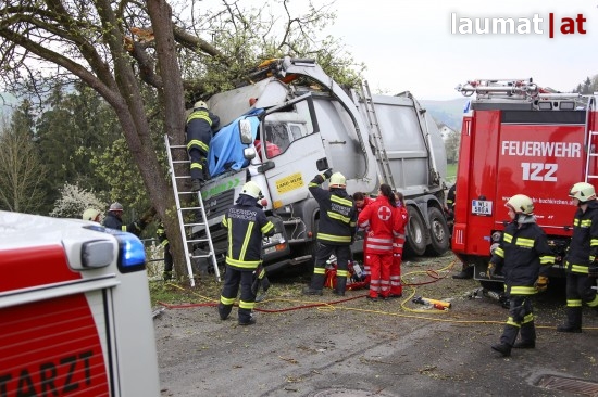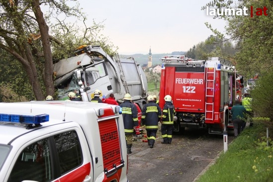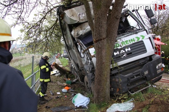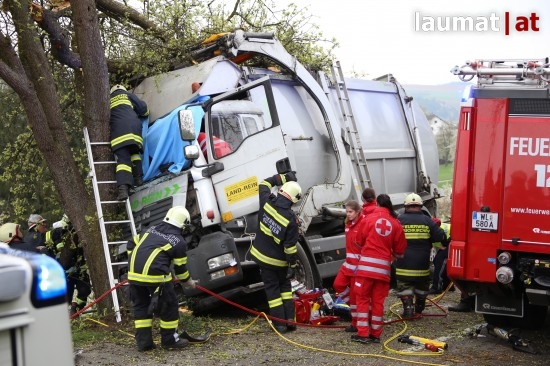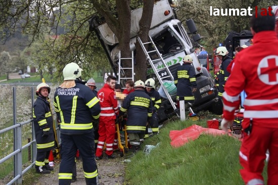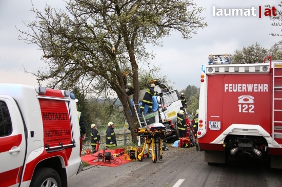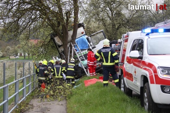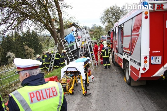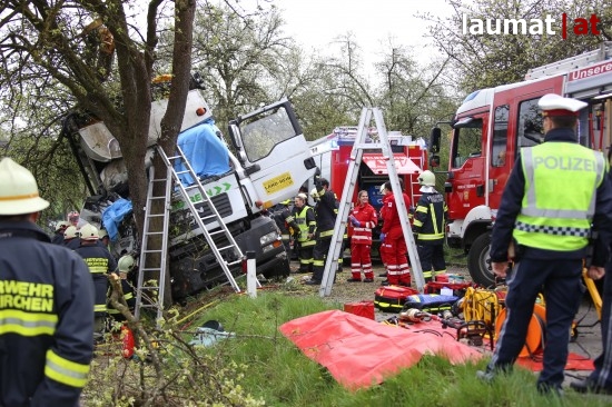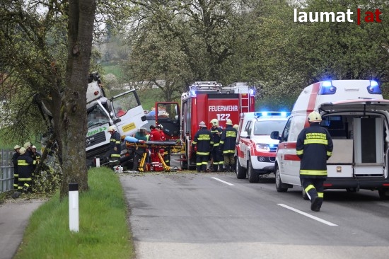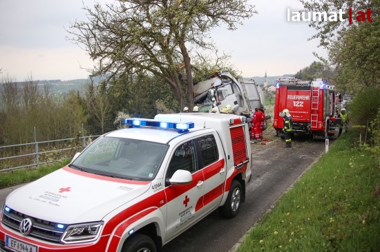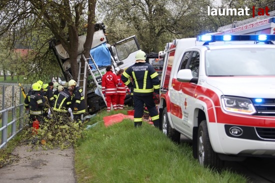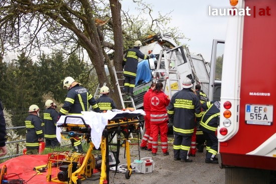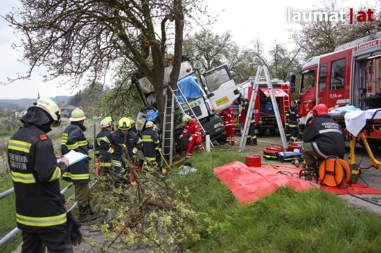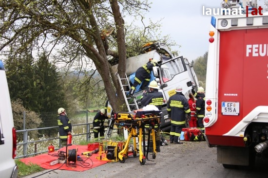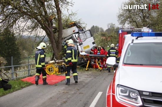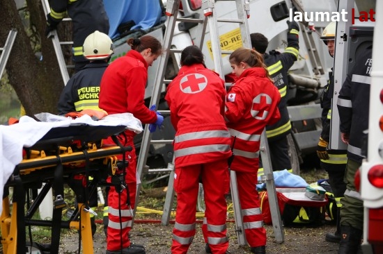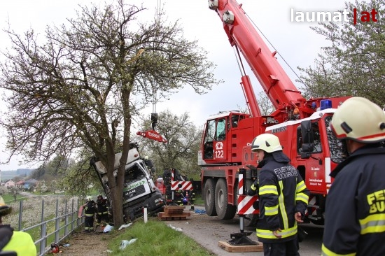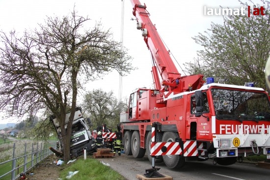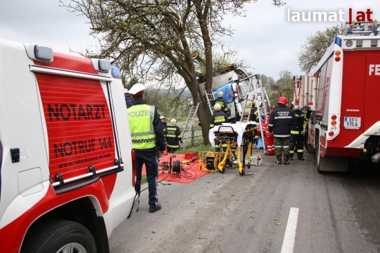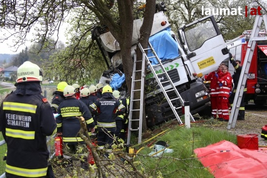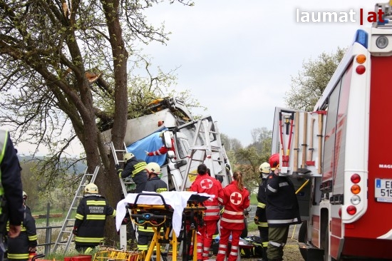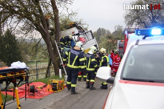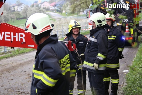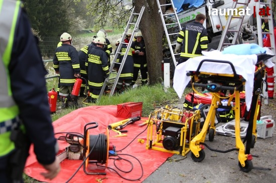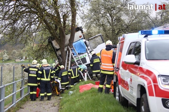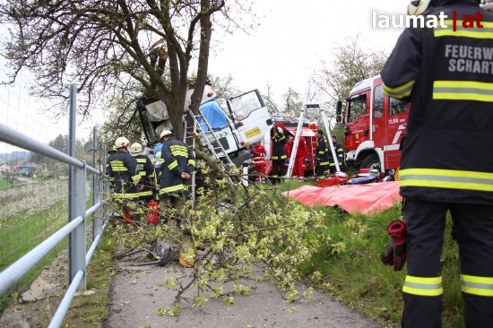 "Die Alarmierung war ein Verkehrsunfall mit eingeklemmter Person. Vorgefunden haben wir einen Lastwagen, der gegen einen Baum gefahren ist. Der Fahrer konnte selbstständig aussteigen. Die Beifahrerin war leider Gottes sehr unglücklich und stark eingeklemmt. Die Rettung der Person hat sich sehr schwierig gestaltet. Wir haben fast eine ganze Stunde versucht das Führerhaus wieder auszustrecken, sodass wir die Person befreien konnten," schildert Albin Schauer, Kommandant der Feuerwehr Scharten.