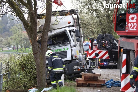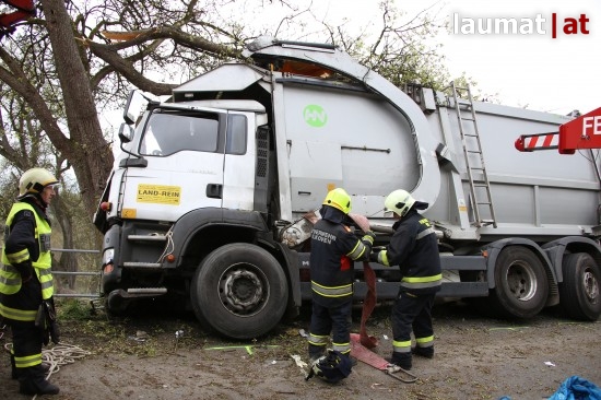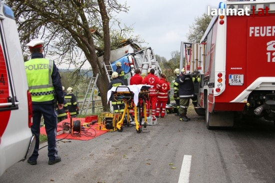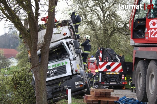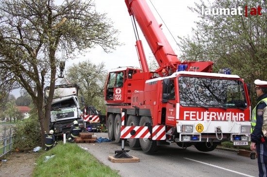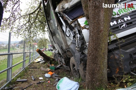 Ein LKW krachte gegen einen Baum neben der Schartner Straße, die Beifahrerin wurde bei dem Unfall schwer im Fahrzeug eingeklemmt.