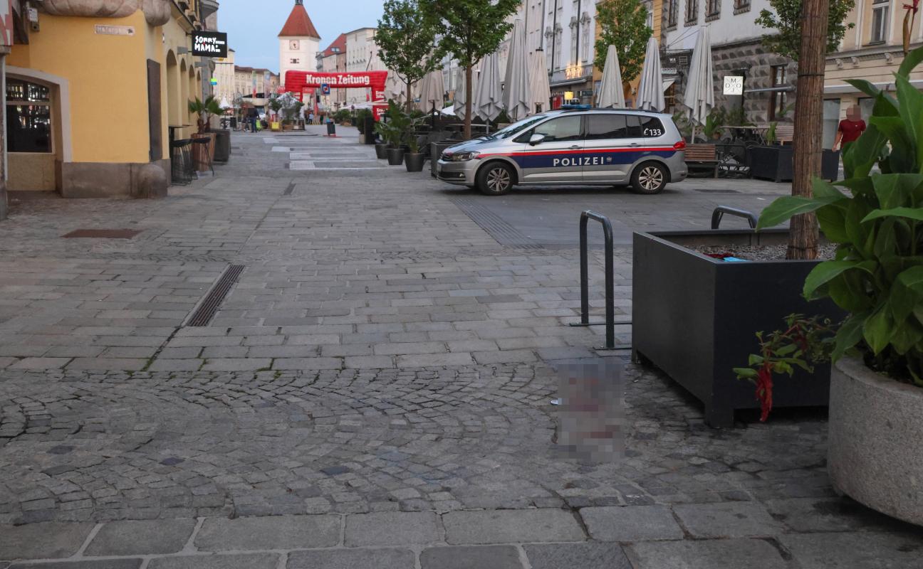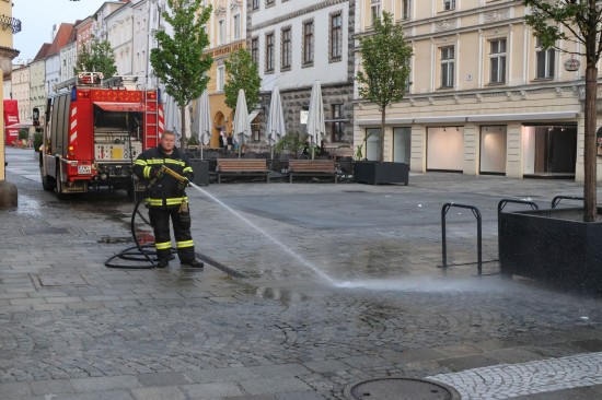 Wels. Die Feuerwehr stand Samstagfrüh in Wels-Innenstadt im Einsatz, um im Auftrag der Exekutive eine Blutspur am Stadtplatz zu beseitigen.