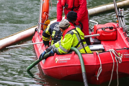 Bootseinsatz der Feuerwehr: Öl auf der Traun bei Marchtrenk mittels Saugwagen abgesaugt