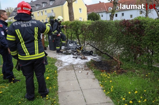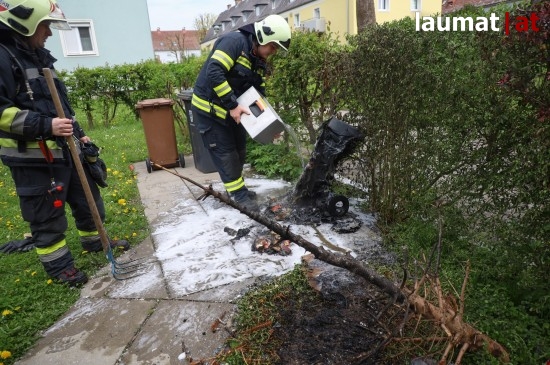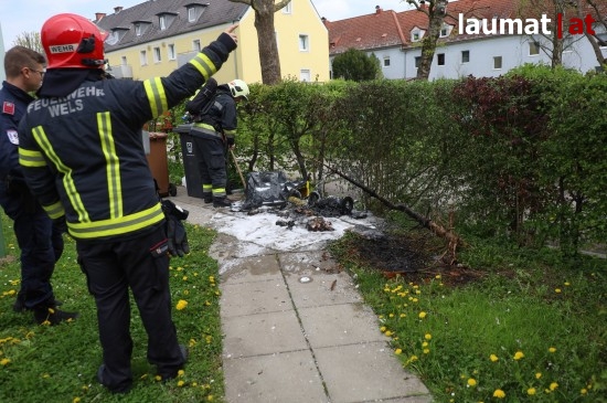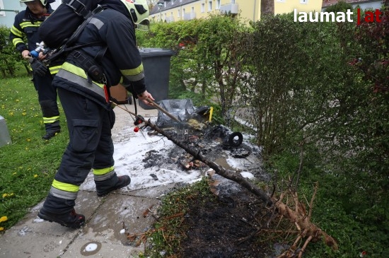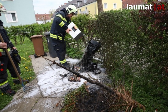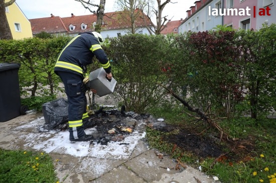 Wels. Die Feuerwehr stand Sonntagvormittag bei einem Brand einer Altpapiertonne sowie eines daneben befindlichen Baumes in Wels-Vogelweide im Einsatz.