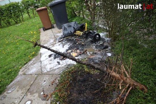 Die Feuerwehr stand Sonntagvormittag bei einem Brand einer Altpapiertonne sowie eines daneben befindlichen Baumes in Wels-Vogelweide im Einsatz.