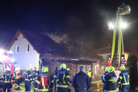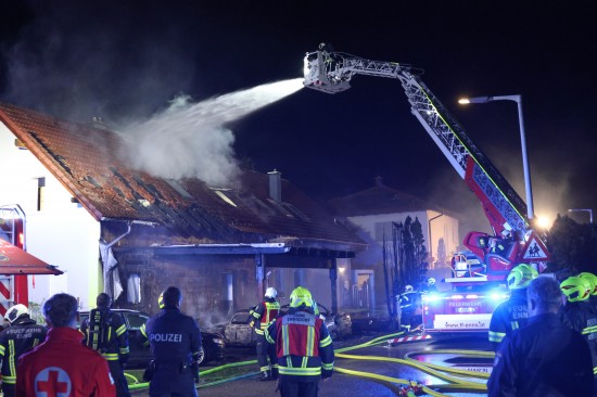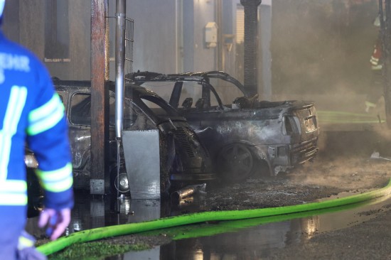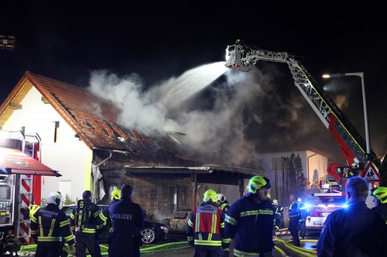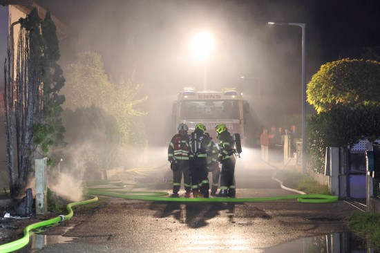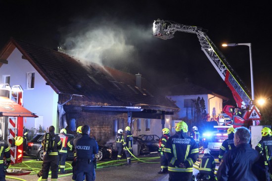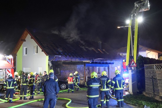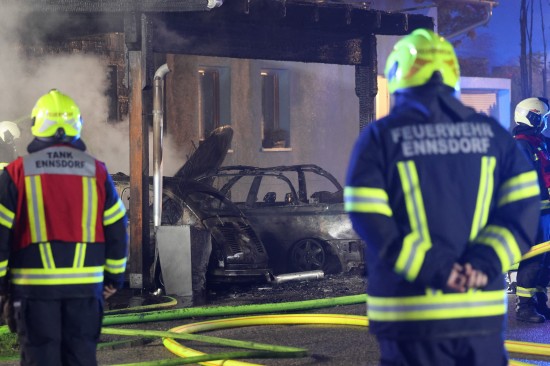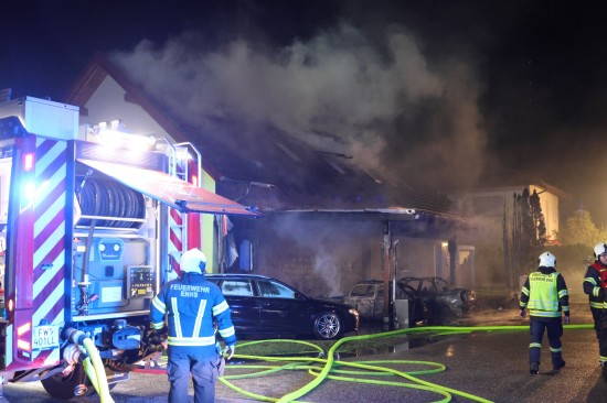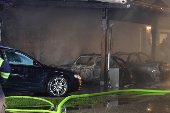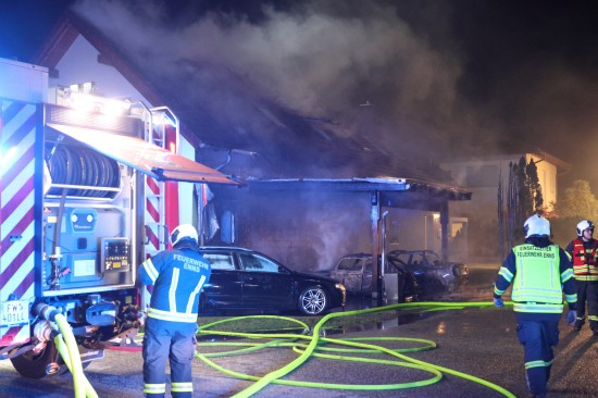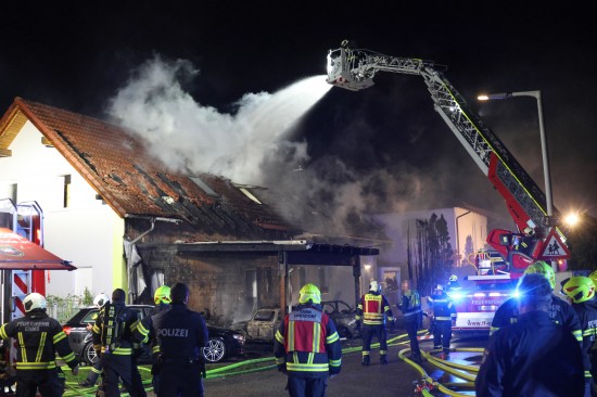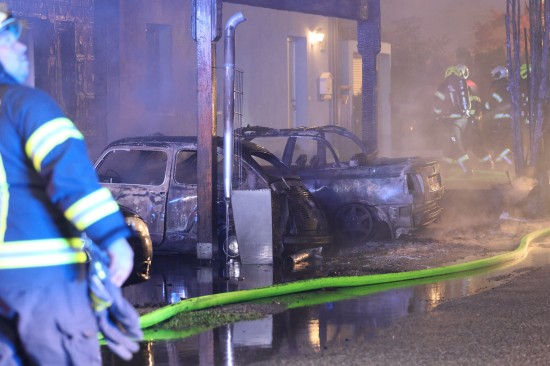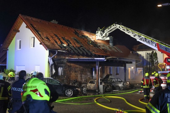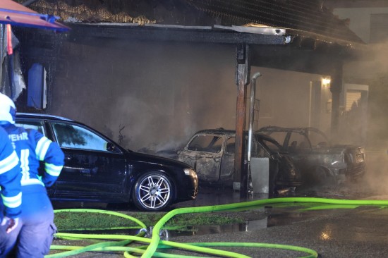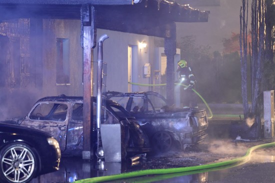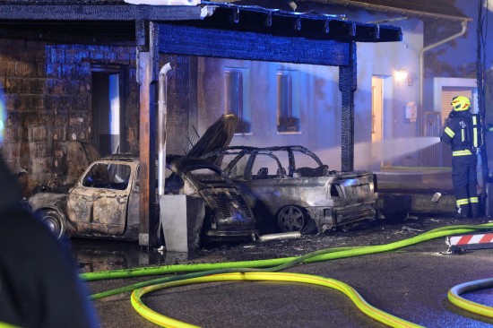 Die Feuerwehr wurde kurz vor Mitternacht mit dem Einsatzbegriff "Brand Fahrzeug in Gebäude" zu einem Brand im Carport vor einer Doppelhaushälfte alarmiert. Das Feuer hatte dann bereits über den Vollwärmeschutz auf das Dach des Hauses übergegriffen. Im Carport befanden sich zumindest zwei PKW und ein Motorrad, welche völlig ausgebrannt sind. Das Haus wurde schwer in Mitleidenschaft gezogen, ein Übergreifen der Flammen auf die zweite Haushälfte konnte so gut wie verhindert werden. Schaden entstand zwar offensichtlich auch dort, allerdings vergleichsweise gering. Die Feuerwehr erhöhte auf Alarmstufe 2 woraufhin Einsatzkräfte von drei Feuerwehren, die Rettung und die Polizei im Einsatz waren. Die Polizei hat die Ermittlungen aufgenommen. Fünf Personen wurden betreut, verletzt wurde aber offensichtlich zum Glück niemand.