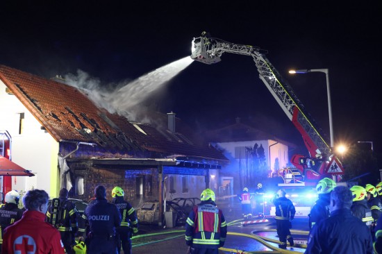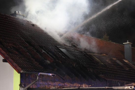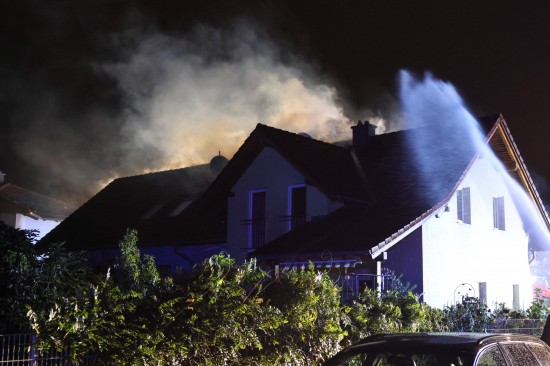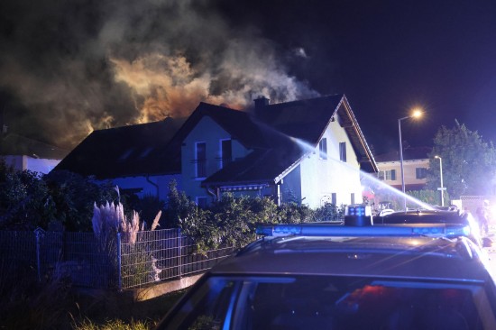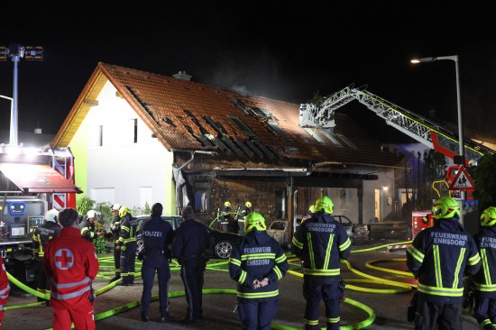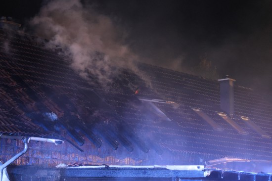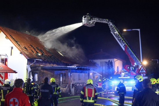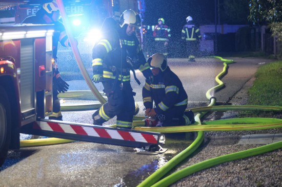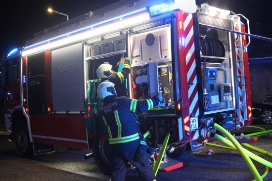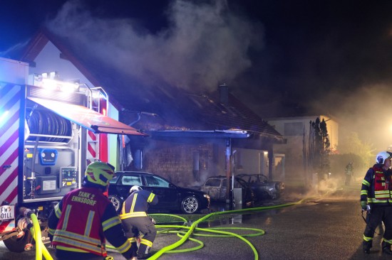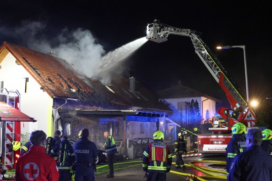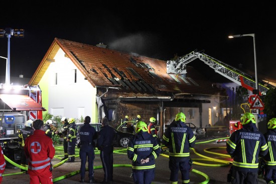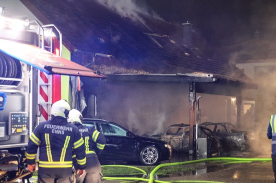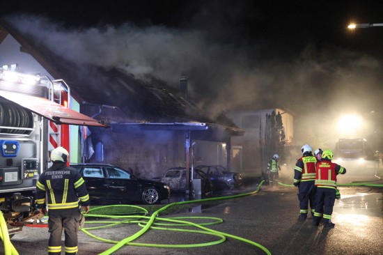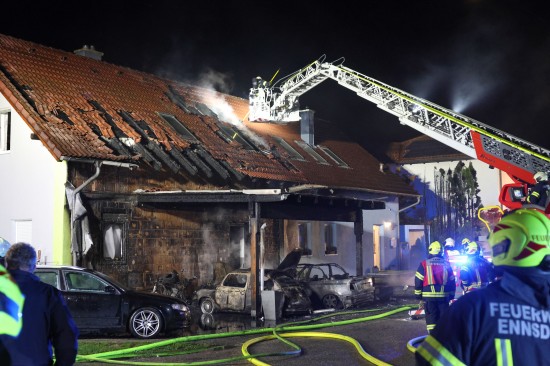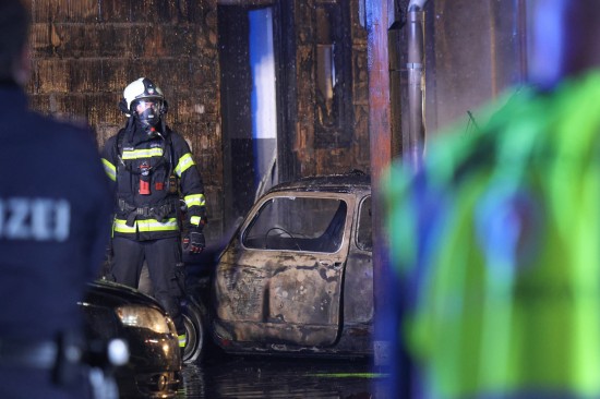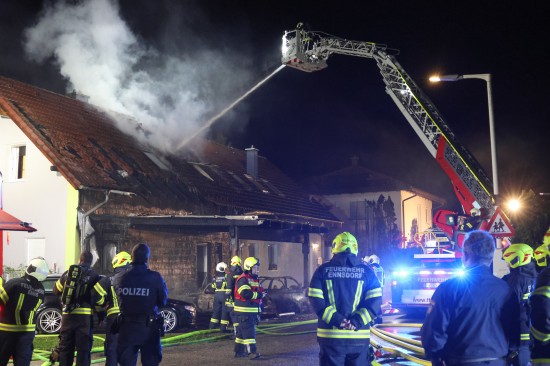 Die Feuerwehr wurde kurz vor Mitternacht mit dem Einsatzbegriff "Brand Fahrzeug in Gebäude" zu einem Brand im Carport vor einer Doppelhaushälfte alarmiert. Das Feuer hatte dann bereits über den Vollwärmeschutz auf das Dach des Hauses übergegriffen. Im Carport befanden sich zumindest zwei PKW und ein Motorrad, welche völlig ausgebrannt sind. Das Haus wurde schwer in Mitleidenschaft gezogen, ein Übergreifen der Flammen auf die zweite Haushälfte konnte so gut wie verhindert werden. Schaden entstand zwar offensichtlich auch dort, allerdings vergleichsweise gering. Die Feuerwehr erhöhte auf Alarmstufe 2 woraufhin Einsatzkräfte von drei Feuerwehren, die Rettung und die Polizei im Einsatz waren. Die Polizei hat die Ermittlungen aufgenommen. Fünf Personen wurden betreut, verletzt wurde aber offensichtlich zum Glück niemand.