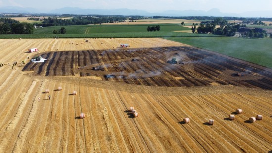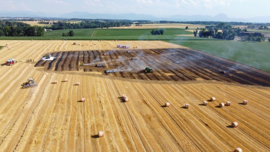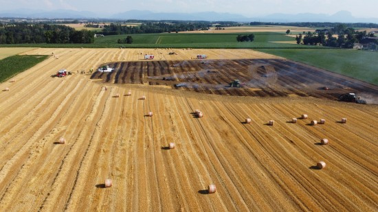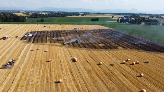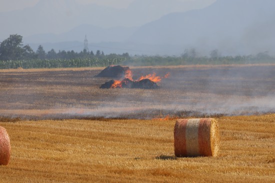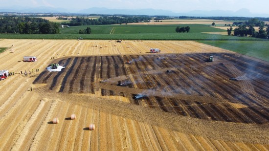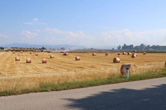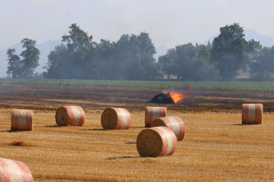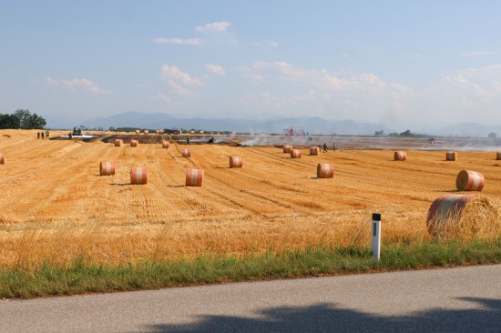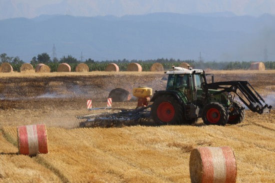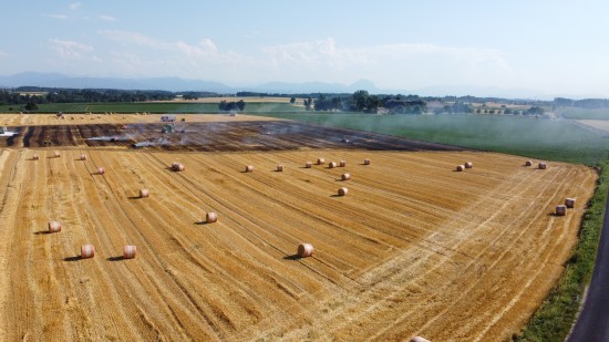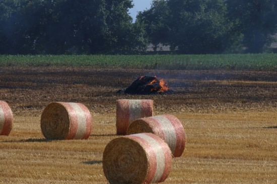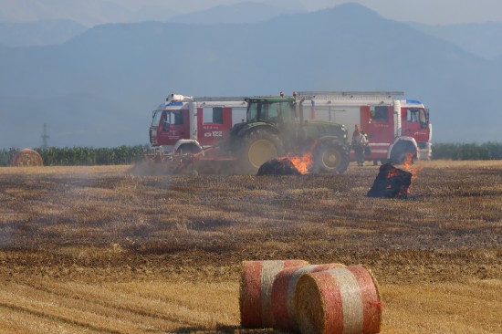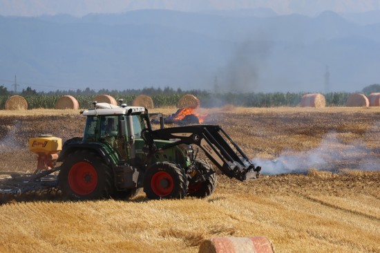 Brand einer Rundballenpresse samt Stoppelfeld in Steinhaus sorgt für Einsatz