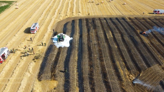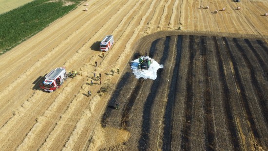 Die Feuerwehr wurde am Nachmittag mit dem Einsatzstichwort "Brand landwirtschaftliches Fahrzeug" auf ein Feld im Gemeindegebiet von Steinhaus alarmiert. Bei Erntearbeiten ist dort offenbar eine Rundballenpresse in Flammen aufgegangen. Das Feuer breitete sich auf das umliegende Stoppelfeld aus. Die alarmierten Kräfte von drei Feuerwehren konnten gemeinsam mit den Landwirten ein weiteres Ausbreiten der Flammen verhindern und den Brand schließlich rasch unter Kontrolle bringen. Verletzt wurde niemand.