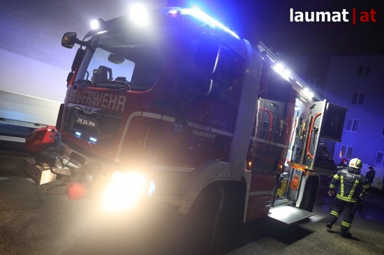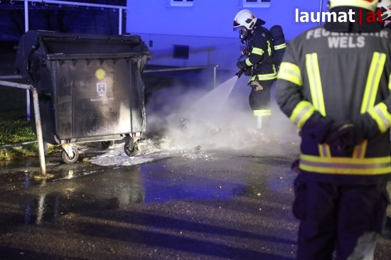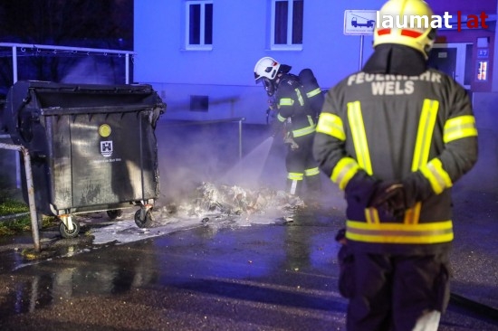 Feuerwehr und Polizei standen in der Nacht auf Samstag bei einem Brand vermutlich eines Abfallcontainers vor einem Mehrparteienwohnhaus in Wels-Neustadt im Einsatz .