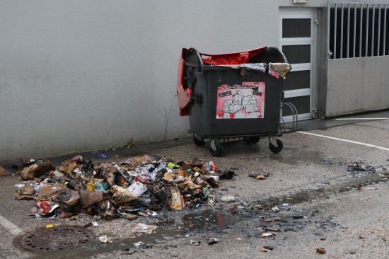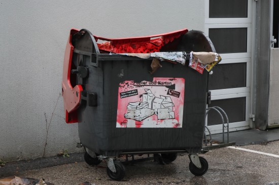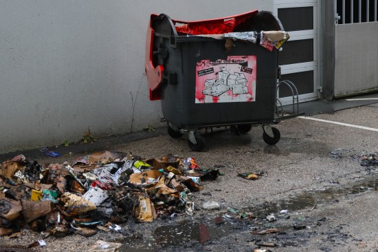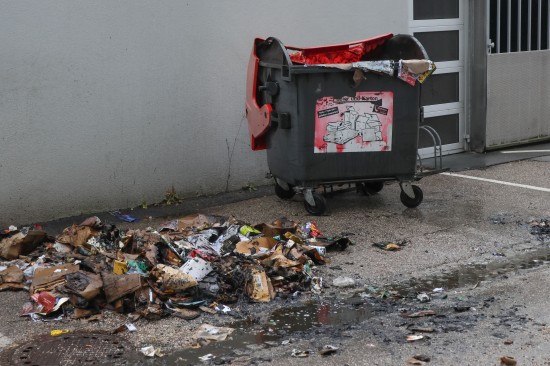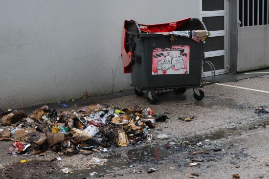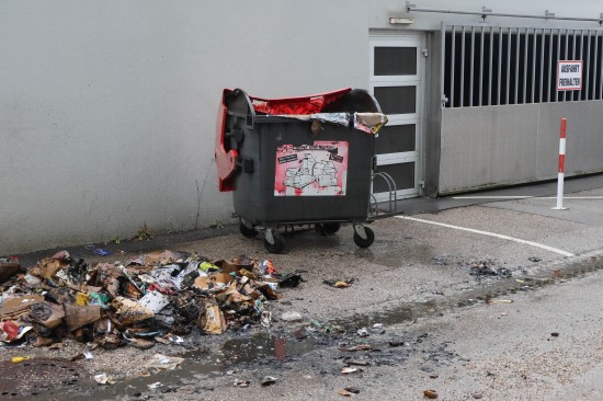 Brand eines Altpapiercontainers vor einem Hochhaus in Wels-Vogelweide