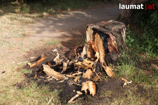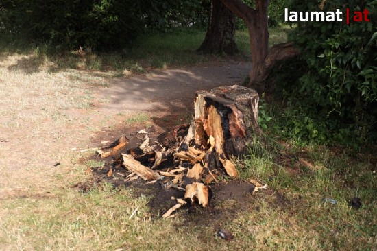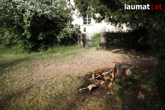 Brand eines Baumstumpfes vor einer Volksschule in Wels-Vogelweide