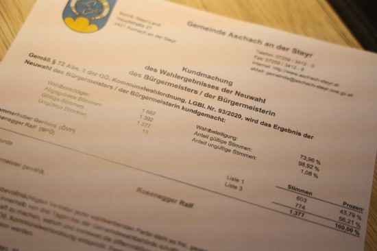 Der bisherige Bürgermeister Hubert Kern (ÖVP) hat im September des vergangenen Jahres sein Amt als Bürgermeister zurückgelegt. Daher waren die Wahlberechtigten der Gemeinde Aschach an der Steyr am Sonntag zur Neuwahl des Bürgermeisters aufgefordert. Für die ÖVP stellte sich Gerhard Kammerhuber der Wahl, die SPÖ schickte Rald Rosenberger ins Rennen um den Bürgermeistersessel. Dem SPÖ-Kandidaten gelang es bei der Wahl am Sonntag, den Bürgermeistersessel von schwarz beziehungsweise türkis auf rot umzufärben.