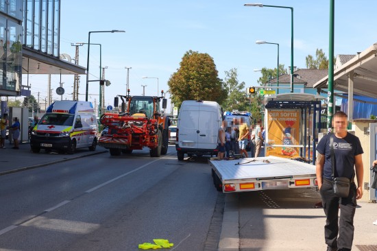 Wels. Zwei Personen mussten Donnerstagvormittag nach einem Verkehrsunfall, bei dem ein Autotransport-Gespann in Wels-Neustadt in eine Bushaltestelle gekracht ist, ins Klinikum gebracht werden.