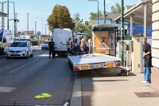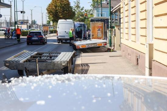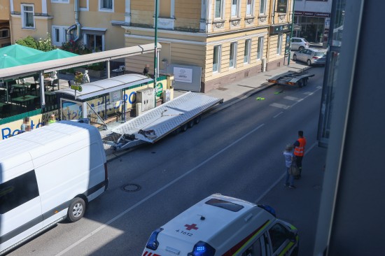"Ein 34-jähriger rumänischer Staatsangehöriger fuhr am 28. August 2025 um 10:50 Uhr mit einem Klein-LKW in Wels auf der Gärtnerstraße in westliche Richtung. Beim Befahren der Fahrbahnschwelle, welche sich im Bereich der Kreuzung mit der Stefan-Fadinger-Straße befindet, löste sich der vom Kraftfahrzeug gezogene Anhänger, welcher mit einem PKW und einem Anhänger beladen war, von der Anhängerkupplung. In Ermangelung des Vorhandenseins einer Sicherungskette rollte der Anhänger ungebremst 43 Meter in westliche Richtung und kollidierte mit der Bushaltestelle auf Höhe Gärtnerstraße Hausnummer 7, wo er schließlich zum Stillstand kam. Zur Unfallzeit befanden sich insgesamt drei Personen in der Bushaltestelle. Eine 84-jährige Welserin wurde leicht, eine 50-jährige Ungarin aus Wels schwer verletzt. Bei dem Zusammenstoß mit der Bushaltstelle wurden das Wartehaus, der Anhänger sowie der darauf befindliche PKW beschädigt. Der 34-Jährige wurde zur sofortigen Vernehmung zur Polizei verbracht und niederschriftlich zum Sachverhalt einvernommen.Weiters wurde eine Sicherheitsleistung eingehoben. Der Anhänger wurde abtransportiert, da aufgrund der fehlenden Sicherungskette sowie aufgrund der abgerissenen Elektronik die Weiterfahrt mit dem Anhänger untersagt wurde."
