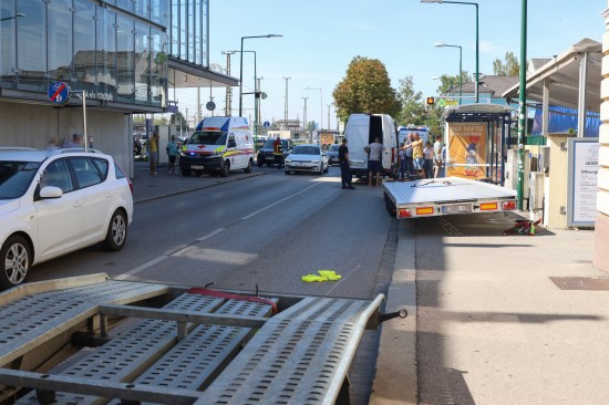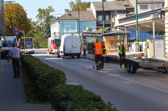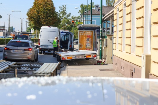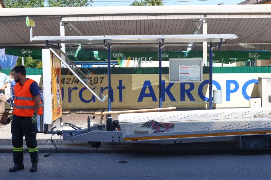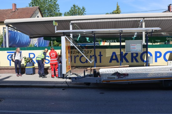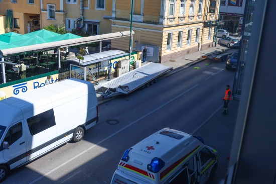 Buswartehäuschen gerammt: Zwei Verletzte bei Verkehrsunfall eines Autotransporters in Wels-Neustadt