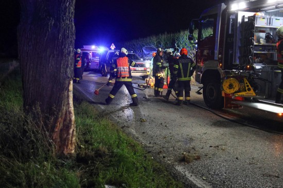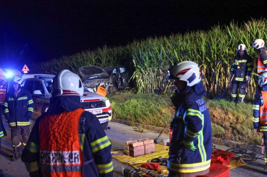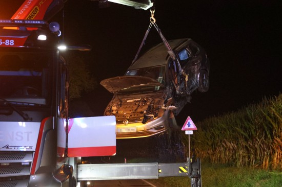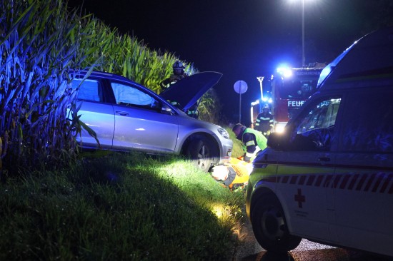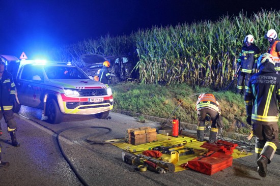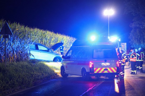 Der Unfall passierte am späten Freitagabend auf der L531 Schartener Straße, Welser Straße, im Gemeindegebiet von Buchkirchen. Ein Autolenker kam aus noch unbekannten Gründen in einer leichten Kurve links von der Fahrbahn ab, streifte einen massiven Obstbaum am Straßenrand, ehe der PKW quer über die Straße, auf die Böschung und dort in ein angrenzendes Maisfeld geschleudert wurde. Die Einsatzkräfte zweier Feuerwehren, die Rettung, der Notarzt und die Polizei wurden zu einem schweren Verkehrsunfall beziehungsweise einer Personenrettung nach einem Verkehrsunfall alarmiert. Der Lenker war zum Glück nicht im Fahrzeug eingeklemmt, beim Eintreffen der Feuerwehr befand er sich bereits auf der Trage der Rettung und wurde dort von den Rettungskräften und dem Notarzt versorgt. Die Feuerwehr sicherte die Unfallstelle ab. In weiterer Folge wurden Aufräumarbeiten durchgeführt, die Straße von Fahrzeugteilen befreit. Das verständigte Abschleppunternehmen führte den Abtransport des Unfallfahrzeuges durch. Der Lenker wurde nach der Erstversorgung am Unfallort mit mittelschweren Verletzungen ins Klinikum Wels eingeliefert.