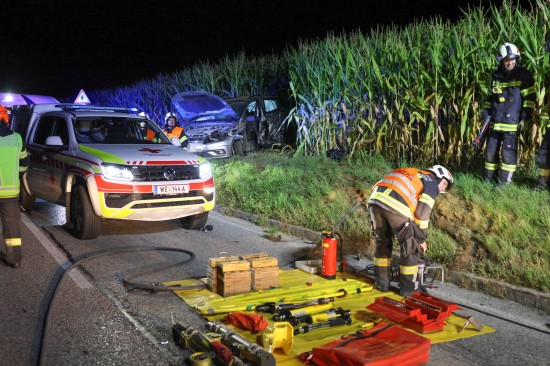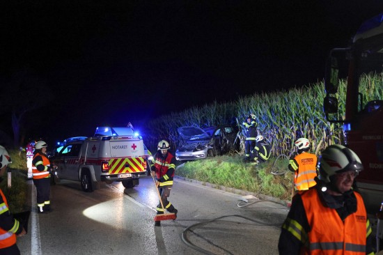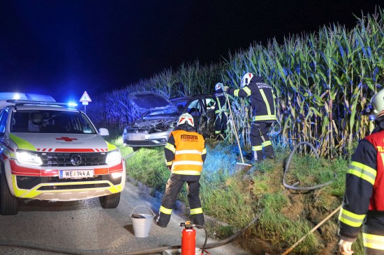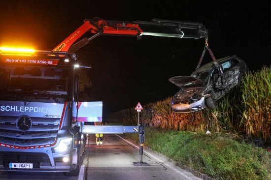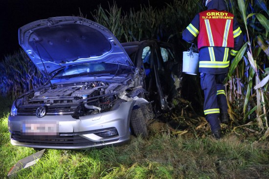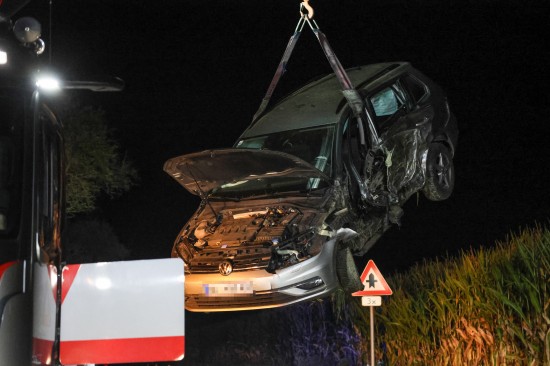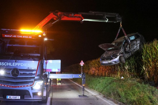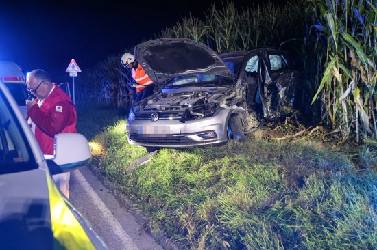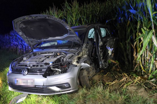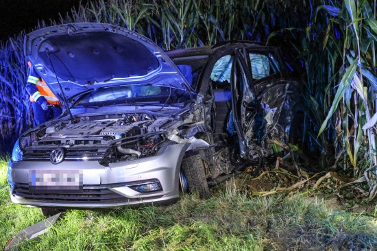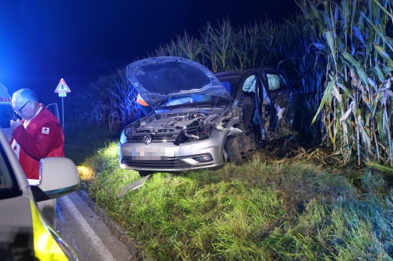 Crash gegen Baum: Verunfalltes Auto landet bei Verkehrsunfall in Buchkirchen im Maisfeld