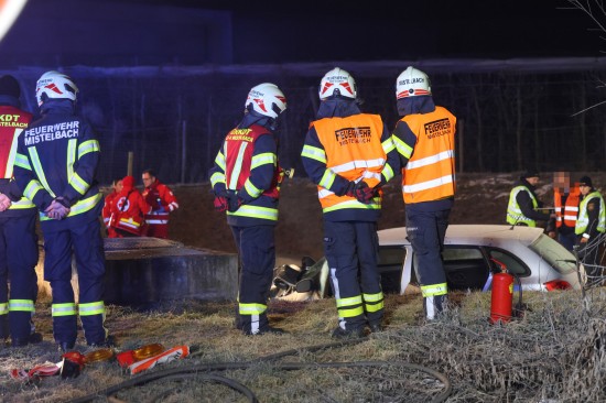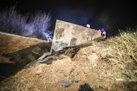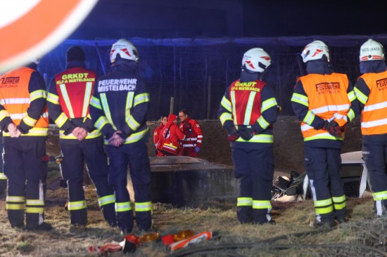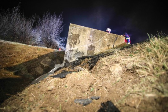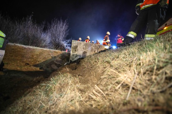 Der Unfall passierte am späten Donnerstagabend auf der L1228 Mistelbacher Straße im Gemeindegebiet von Holzhausen, wo ein PKW aus noch unbekannten Gründen offensichtlich links von der Fahrbahn abkam, über die Böschung in ein Regenrückhaltebecken fuhr und dort gegen den massiven Abflussschacht aus Beton krachte. Der PKW wurde dabei im Frontbereich massiv beschädigt und kam so im Regenrückhaltebecken zum Stillstand. Die Einsatzkräfte dreier Feuerwehren wurden zur Personenrettung an die Einsatzstelle gerufen, ebenso mehrere Rettungsfahrzeuge und zwei Notarztteams sowie die Polizei. Entgegen der ersten Meldungen war zum Glück niemand im Unfallwrack eingeklemmt oder eingeschlossen. Zwei Personen waren mittelschwer verletzt. Sie wurden nach der Erstversorgung am Unfallort ins Krankenhaus eingeliefert. Weil es anfangs offenbar unklare Angaben zum Lenker gab, kam auch noch eine Drohne zum Einsatz, der Nahbereich wurde nach eventuell weiteren Verletzten abgesucht.