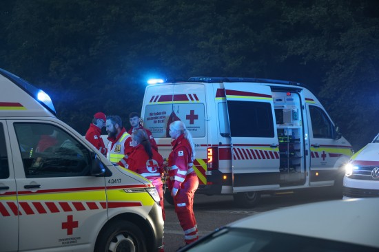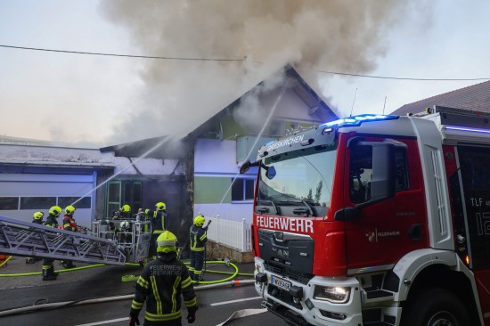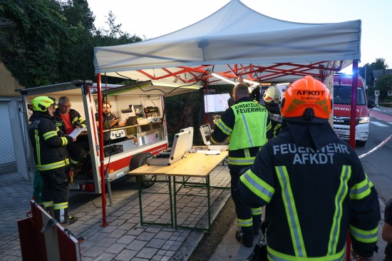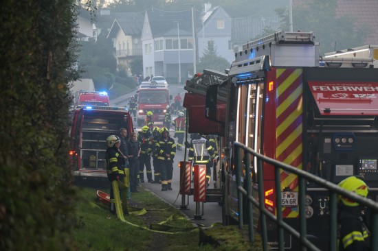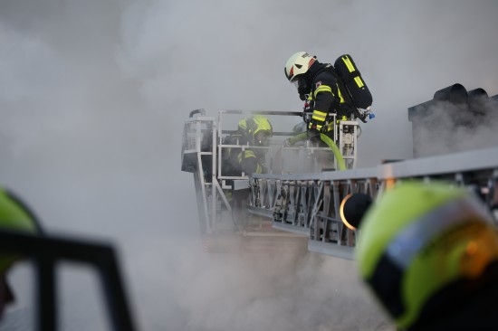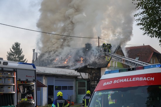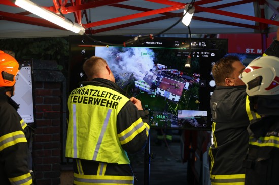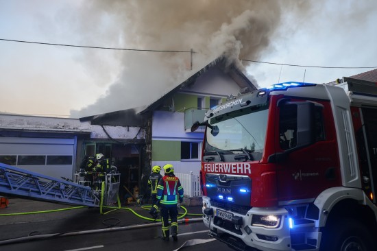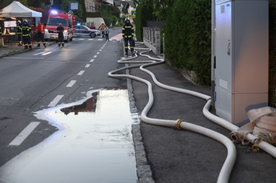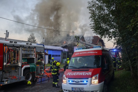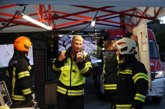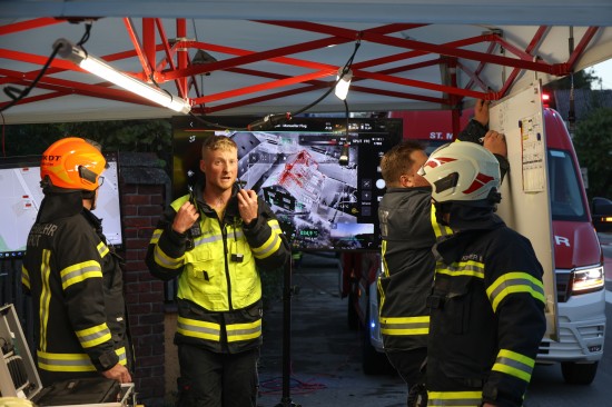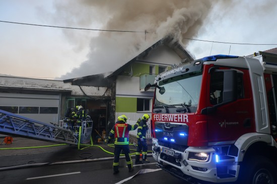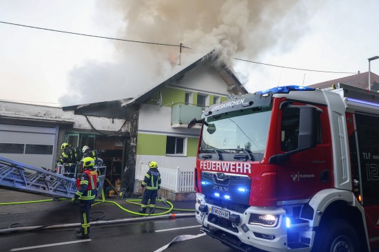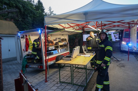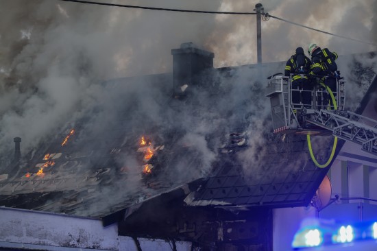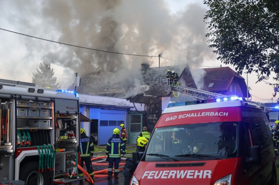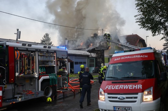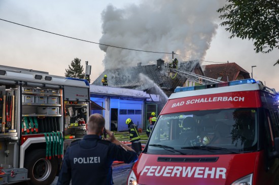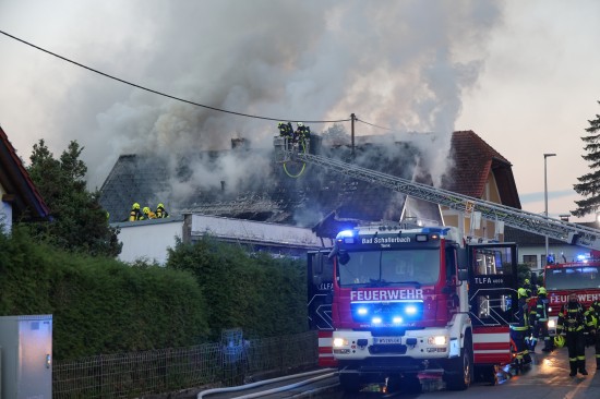 Die Einsatzkräfte von sieben Feuerwehren wurden am Abend mit dem Einsatzstichwort "Brand Gebäude" nach Bad Schallerbach alarmiert. Anfangs war offenbar von einem Brand eines Gebäudeanbaus die Rede, beim Eintreffen der ersten Einsatzkräfte am Einsatzort zeigte sich, dass der Brand bereits ein größeres Ausmaß angenommen hatte. Die Feuerwehr erhöhte auf Alarmstufe 2, letztendlich standen daraufhin Einsatzkräfte von insgesamt sieben Wehren im Löscheinsatz. Der Dachbereich des Gebäudes - ein Wohnhaus sowie angebaute Garagen - stand in Vollbrand. Die Feuerwehr bekämpfte den Brand von allen Seiten sowie von der Drehleiter von oben. Verletzte soll es laut ersten Informationen zum Glück nicht gegeben haben. Vier Personen - zwei Erwachsene und zwei Kinder - wurden von der Krisenintervention psychologisch betreut. Die Feuerwehr errichtete von mehreren Seiten her Löschwasserzubringerleitungen. Die Drohne der Feuerwehr stand ebenso im Einsatz. Zwischenzeitlich mussten die Einsatzkräfte auch zahlreiche anwesende Schaulustige zurecht weisen, die sich immer wieder im unmittelbaren Einsatzbereich und teils auch direkt im dichten Rauch aufgehalten hatten.