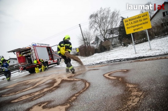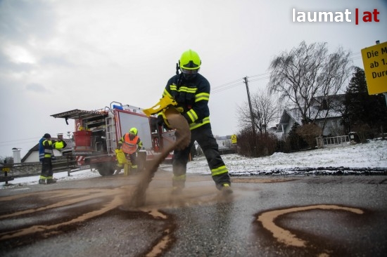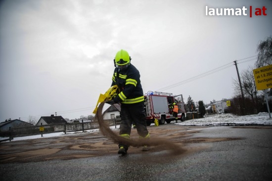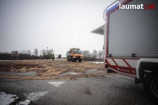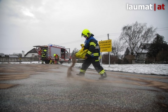 Die Einsatzkräfte von Feuerwehr, Polizei sowie eine Kehrmaschine standen im Einsatz, um das ausgetretene Öl zu binden.