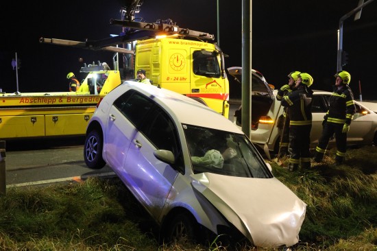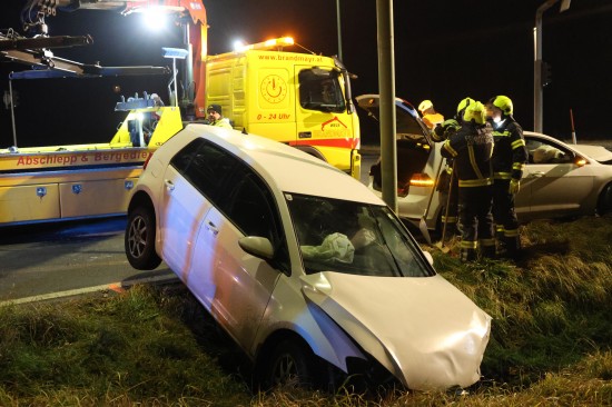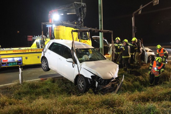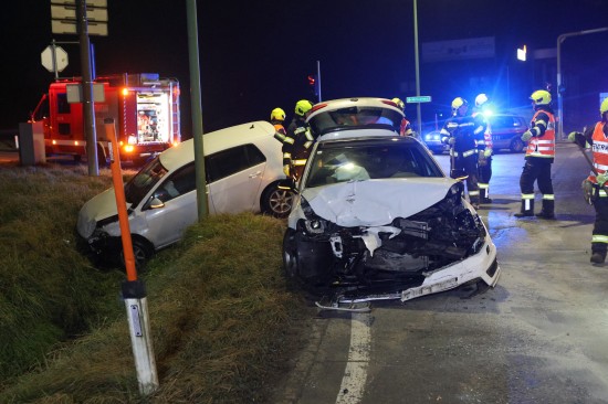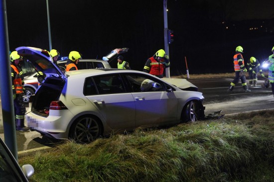 Der Unfall passierte Samstagabend im ampelgeregelten Kreuzungsbereich der B138 Pyhrnpass Straße mit der L1238 Sipbachzeller Straße und der Sipbachzeller Straße, im Gemeindegebiet von Thalheim bei Wels. Ersten Angaben nach dürfte offenbar ein Fahrzeug bei Rotlicht in die Kreuzung eingefahren sein, woraufhin es zur Kollision mit dem Querverkehr gekommen ist. Eines der Unfallfahrzeuge wurde in den Straßengraben geschleudert, das zweite kam schwer beschädigt auf der B138 Pyhrnpass Straße zum Stehen. Drei Personen wurden bei dem Unfall leicht verletzt. Sie wurden vom Roten Kreuz versorgt und anschließend ins Klinikum Wels gebracht. Die Feuerwehr wurde etwas später zu den Aufräumarbeiten ebenfalls an die Unfallstelle gerufen. Zwischenzeitlich krachte es an der Unfallstelle erneut. Zwischen zwei PKW kam es zu einem Auffahrunfall - diesmal endete der Unfall zum Glück glimpflich mit Blechschaden. Die Fahrzeuge des Folgeunfalls waren fahrbereit und wurden zum Datenaustausch aus dem Kreuzungsbereich gelotst. Die Feuerwehr führte währenddessen beim ursprünglichen Unfall die Aufräumarbeiten durch und unterstützte das Abschleppunternehmen beim Abtransport der Fahrzeuge.