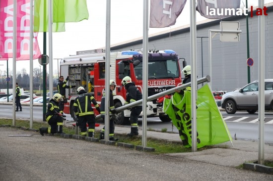 Die Einsatzkräfte wurden von der Polizei alarmiert, nachdem am Rande eines Fachmarktzentrums ein Fahnenmast durch einen Unfall in Schieflage geraten ist. Die Einsatzkräfte der Feuerwehr schnitten den Fahnenmast um und legten diesen in der dortigen Grüninsel ab.